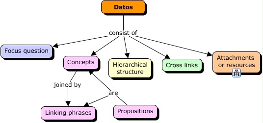 Este Cmap, tiene información relacionada con: Cmap Structure, Concepts joined by Linking phrases, Propositions are Linking phrases, Datos consist of Focus question, Propositions are Concepts, Datos consist of Concepts, Datos consist of Hierarchical structure, Datos consist of Cross links, Datos consist of Attachments or resources