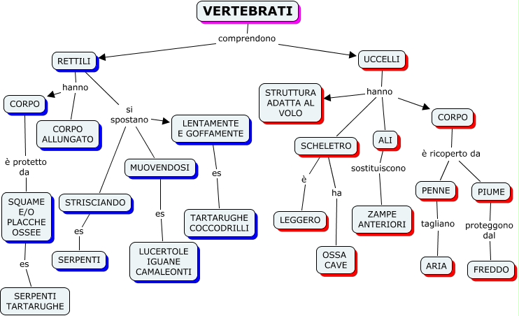 VERTEBRATI_2, SQUAME E/O PLACCHE OSSEE es SERPENTI TARTARUGHE, PIUME proteggono dal FREDDO, MUOVENDOSI es LUCERTOLE IGUANE CAMALEONTI, CORPO è ricoperto da PIUME, VERTEBRATI comprendono UCCELLI, UCCELLI hanno STRUTTURA ADATTA AL VOLO, RETTILI si spostano LENTAMENTE E GOFFAMENTE, VERTEBRATI comprendono RETTILI, RETTILI hanno CORPO, UCCELLI hanno SCHELETRO