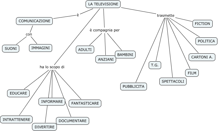 Questa Cmap, creata con IHMC CmapTools, contiene informazioni relative a: LA TELEVISIONE, COMUNICAZIONE con SUONI, LA TELEVISIONE trasmette CARTONI A., LA TELEVISIONE ha lo scopo di EDUCARE, LA TELEVISIONE ha lo scopo di DIVERTIRE, LA TELEVISIONE è compagnia per BAMBINI, LA TELEVISIONE trasmette POLITICA, LA TELEVISIONE trasmette SPETTACOLI, LA TELEVISIONE trasmette PUBBLICITA, LA TELEVISIONE ha lo scopo di DOCUMENTARE, LA TELEVISIONE ha lo scopo di FANTASTICARE, LA TELEVISIONE ha lo scopo di INTRATTENERE, COMUNICAZIONE con IMMAGINI, LA TELEVISIONE è compagnia per ADULTI, LA TELEVISIONE trasmette FICTION, LA TELEVISIONE trasmette FILM, LA TELEVISIONE è COMUNICAZIONE, LA TELEVISIONE ha lo scopo di INFORMARE, LA TELEVISIONE trasmette T.G., LA TELEVISIONE è compagnia per ANZIANI