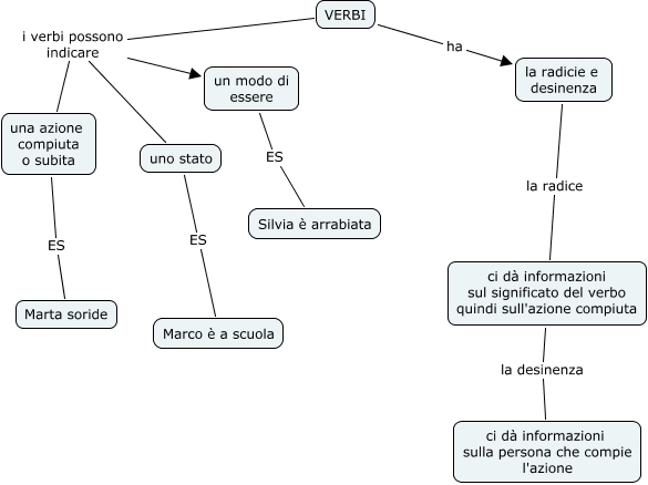 Questa Cmap, creata con IHMC CmapTools, contiene informazioni relative a: VERB_jennipherI, VERBI i verbi possono indicare una azione compiuta o subita, VERBI i verbi possono indicare un modo di essere, uno stato ES Marco è a scuola, VERBI ha la radicie e desinenza, una azione compiuta o subita ES Marta soride, la radicie e desinenza la radice ci dà informazioni sul significato del verbo quindi sull'azione compiuta, un modo di essere ES Silvia è arrabiata, ci dà informazioni sul significato del verbo quindi sull'azione compiuta la desinenza ci dà informazioni sulla persona che compie l'azione, VERBI i verbi possono indicare uno stato