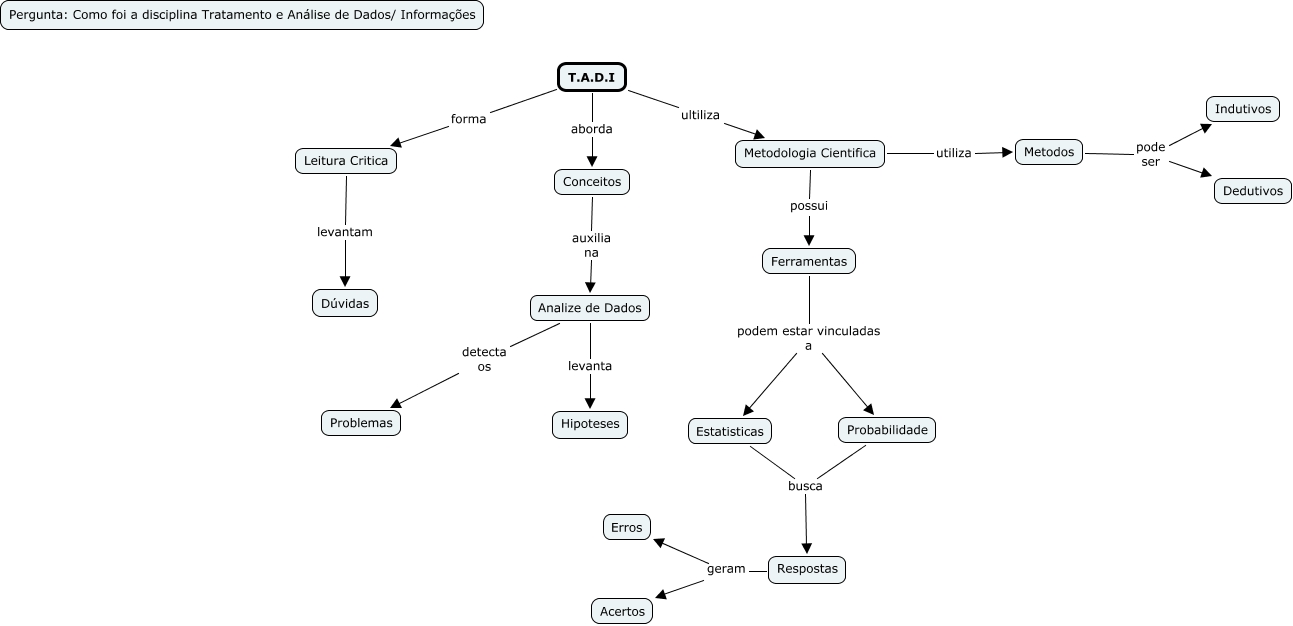 This Concept Map, created with IHMC CmapTools, has information related to: TADI32, T.A.D.I aborda Conceitos, Ferramentas podem estar vinculadas a Estatisticas, Respostas geram Acertos, Analize de Dados levanta Hipoteses, Ferramentas podem estar vinculadas a Probabilidade, Estatisticas busca Respostas, Leitura Critica levantam Dúvidas, T.A.D.I ultiliza Metodologia Cientifica, Metodologia Cientifica possui Ferramentas, Respostas geram Erros, Metodos pode ser Dedutivos, Probabilidade busca Respostas, Metodos pode ser Indutivos, Conceitos auxilia na Analize de Dados, Analize de Dados detecta os Problemas, Metodologia Cientifica utiliza Metodos