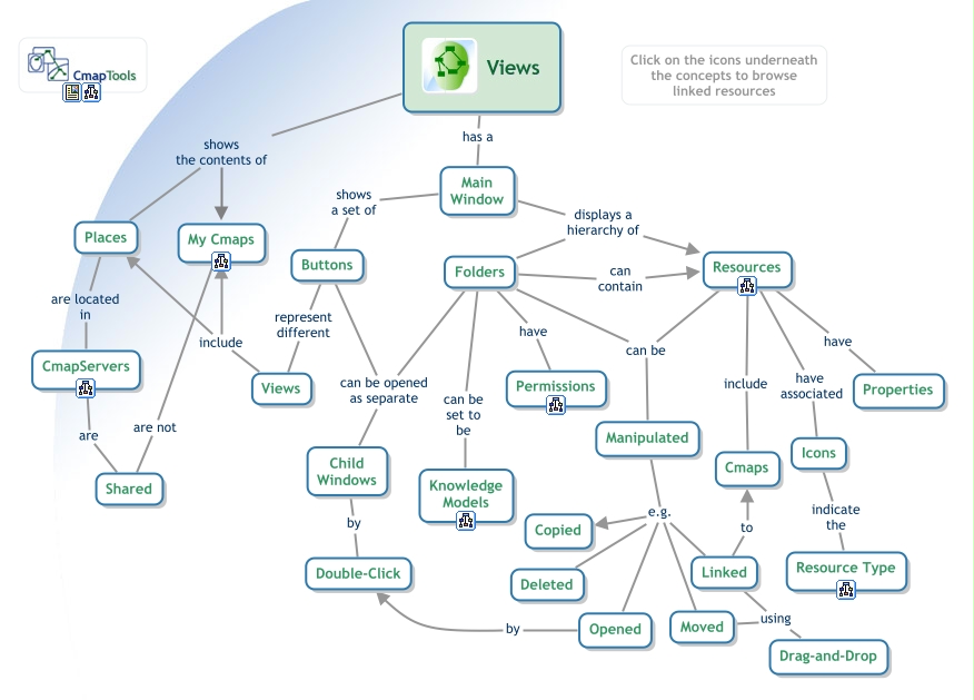 This Concept Map, created with IHMC CmapTools, has information related to: CmapTools - Views, Resources have Properties, Main Window displays a hierarchy of Resources, CmapTools Views shows the contents of Places, Linked using Drag-and-Drop, CmapTools Views has a Main Window, Moved using Drag-and-Drop, Manipulated e.g. Opened, Buttons can be opened as separate Child Windows, Manipulated e.g. Deleted, Folders can be Manipulated, Folders can be opened as separate Child Windows, Manipulated e.g. Moved, Views include Places, Manipulated e.g. Linked, Views include My Cmaps, Main Window shows a set of Buttons, Child Windows by Double-Click, Main Window displays a hierarchy of Folders, Folders can contain Resources, Buttons represent different Views