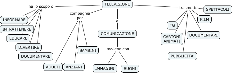 Questa Cmap, creata con IHMC CmapTools, contiene informazioni relative a: TELEVISIONE, TELEVISIONE trasmette PUBBLICITA', TELEVISIONE trasmette CARTONI ANIMATI, TELEVISIONE compagnia per BAMBINI, TELEVISIONE ha lo scopo di EDUCARE, TELEVISIONE trasmette SPETTACOLI, TELEVISIONE ha lo scopo di DOCUMENTARE, TELEVISIONE ha lo scopo di DIVERTIRE, TELEVISIONE compagnia per ANZIANI, TELEVISIONE ha lo scopo di INTRATTENERE, COMUNICAZIONE avviene con IMMAGINI, TELEVISIONE trasmette FILM, COMUNICAZIONE avviene con SUONI, TELEVISIONE è COMUNICAZIONE, TELEVISIONE trasmette DOCUMENTARI, TELEVISIONE trasmette TG, TELEVISIONE ha lo scopo di INFORMARE, TELEVISIONE compagnia per ADULTI