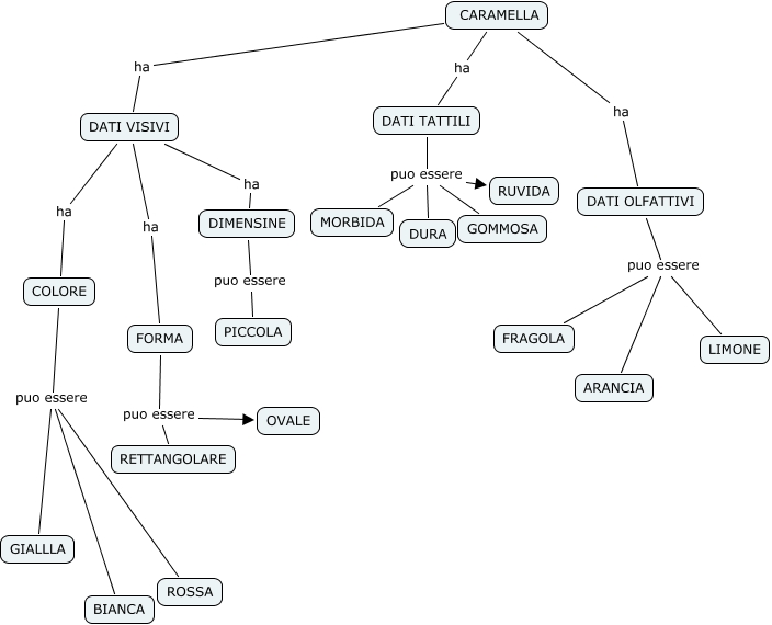 Questa Cmap, creata con IHMC CmapTools, contiene informazioni relative a: CARAMELLA, DATI OLFATTIVI puo essere LIMONE, COLORE puo essere BIANCA, COLORE puo essere GIALLLA, CARAMELLA ha DATI VISIVI, CARAMELLA ha DATI TATTILI, DATI TATTILI puo essere RUVIDA, DATI TATTILI puo essere DURA, DATI VISIVI ha COLORE, DATI TATTILI puo essere MORBIDA, COLORE puo essere ROSSA, DIMENSINE puo essere PICCOLA, DATI TATTILI puo essere GOMMOSA, FORMA puo essere RETTANGOLARE, CARAMELLA ha DATI OLFATTIVI, DATI OLFATTIVI puo essere FRAGOLA, DATI OLFATTIVI puo essere ARANCIA, DATI VISIVI ha DIMENSINE, DATI VISIVI ha FORMA, FORMA puo essere OVALE