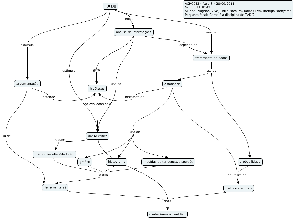 This Concept Map, created with IHMC CmapTools, has information related to: TADI342, senso crítico requer método indutivo/dedutivo, histograma é uma ferramenta(s), estatistica usa de histograma, medidas de tendencia/dispersão é uma ferramenta(s), argumentação usa de ferramenta(s), senso crítico gera conhecimento científico, estatistica necessita de hipóteses, TADI estimula argumentação, análise de informações gera hipóteses, metodo científico gera conhecimento científico, TADI ensina tratamento de dados, estatistica usa de medidas de tendencia/dispersão, TADI exige análise de informações, hipóteses são avaliadas pelo senso crítico, método indutivo/dedutivo é uma ferramenta(s), probabilidade se utiliza do metodo científico, ferramenta(s) gera conhecimento científico, gráfico é uma ferramenta(s), análise de informações depende do tratamento de dados, tratamento de dados usa da estatistica