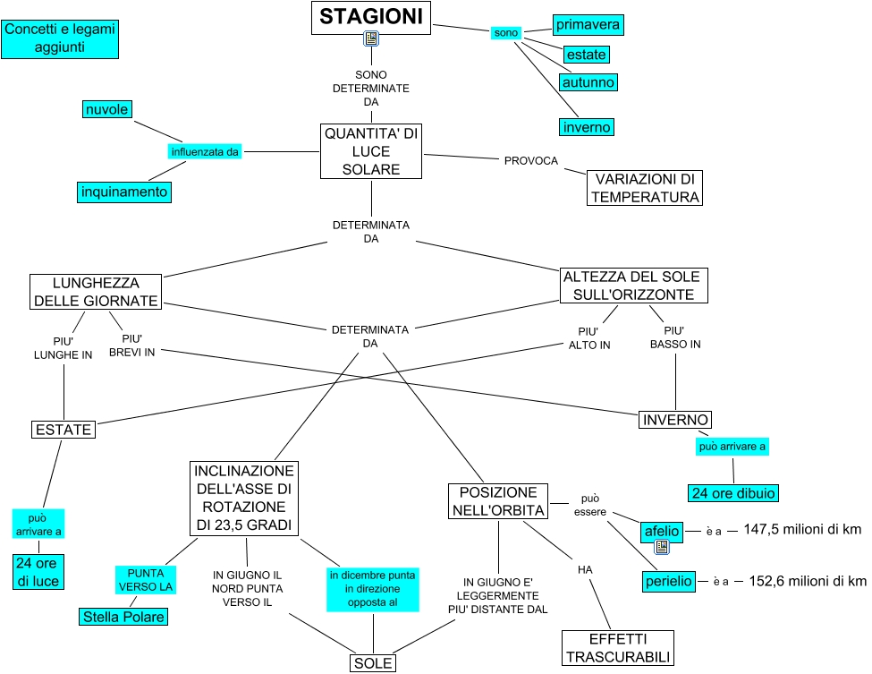 Questa Cmap, creata con IHMC CmapTools, contiene informazioni relative a: stagioni_plus, QUANTITA' DI LUCE SOLARE influenzata da nuvole, STAGIONI SONO DETERMINATE DA QUANTITA' DI LUCE SOLARE, ESTATE può arrivare a 24 ore di luce, ALTEZZA DEL SOLE SULL'ORIZZONTE PIU' BASSO IN INVERNO, POSIZIONE NELL'ORBITA IN GIUGNO E' LEGGERMENTE PIU' DISTANTE DAL SOLE, LUNGHEZZA DELLE GIORNATE PIU' LUNGHE IN ESTATE, INCLINAZIONE DELL'ASSE DI ROTAZIONE DI 23,5 GRADI in dicembre punta in direzione opposta al SOLE, STAGIONI sono autunno, STAGIONI sono estate, QUANTITA' DI LUCE SOLARE DETERMINATA DA ALTEZZA DEL SOLE SULL'ORIZZONTE, LUNGHEZZA DELLE GIORNATE DETERMINATA DA POSIZIONE NELL'ORBITA, QUANTITA' DI LUCE SOLARE influenzata da inquinamento, perielio è a 152,6 milioni di km, LUNGHEZZA DELLE GIORNATE PIU' BREVI IN INVERNO, STAGIONI sono inverno, POSIZIONE NELL'ORBITA può essere perielio, ALTEZZA DEL SOLE SULL'ORIZZONTE DETERMINATA DA INCLINAZIONE DELL'ASSE DI ROTAZIONE DI 23,5 GRADI, POSIZIONE NELL'ORBITA può essere afelio, POSIZIONE NELL'ORBITA HA EFFETTI TRASCURABILI, QUANTITA' DI LUCE SOLARE PROVOCA VARIAZIONI DI TEMPERATURA