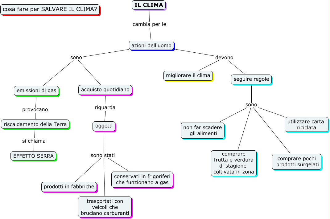 Questa Cmap, creata con IHMC CmapTools, contiene informazioni relative a: salvare il clima, azioni dell'uomo devono seguire regole, oggetti sono stati prodotti in fabbriche, seguire regole sono utilizzare carta riciclata, seguire regole sono non far scadere gli alimenti, oggetti sono stati trasportati con veicoli che bruciano carburanti, acquisto quotidiano riguarda oggetti, seguire regole sono comprare pochi prodotti surgelati, IL CLIMA cambia per le azioni dell'uomo, riscaldamento della Terra si chiama EFFETTO SERRA, azioni dell'uomo sono acquisto quotidiano, azioni dell'uomo devono migliorare il clima, emissioni di gas provocano riscaldamento della Terra, seguire regole sono comprare frutta e verdura di stagione coltivata in zona, azioni dell'uomo sono emissioni di gas, oggetti sono stati conservati in frigoriferi che funzionano a gas