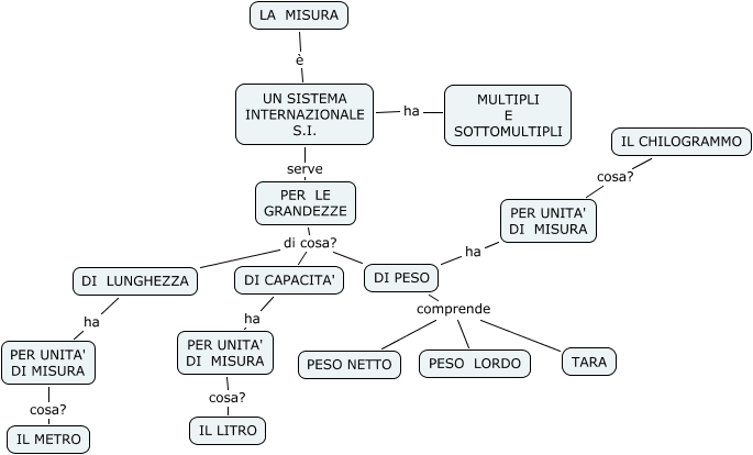 Questa Cmap, creata con IHMC CmapTools, contiene informazioni relative a: 4°C e 4°B, DI PESO comprende PESO LORDO, UN SISTEMA INTERNAZIONALE S.I. ha MULTIPLI E SOTTOMULTIPLI, DI CAPACITA' ha PER UNITA' DI MISURA, DI PESO ha PER UNITA' DI MISURA, DI LUNGHEZZA ha PER UNITA' DI MISURA, PER LE GRANDEZZE di cosa? DI LUNGHEZZA, DI PESO comprende PESO NETTO, PER UNITA' DI MISURA cosa? IL CHILOGRAMMO, LA MISURA è UN SISTEMA INTERNAZIONALE S.I., UN SISTEMA INTERNAZIONALE S.I. serve PER LE GRANDEZZE, PER UNITA' DI MISURA cosa? IL METRO, PER LE GRANDEZZE di cosa? DI CAPACITA', PER UNITA' DI MISURA cosa? IL LITRO, DI PESO comprende TARA, PER LE GRANDEZZE di cosa? DI PESO