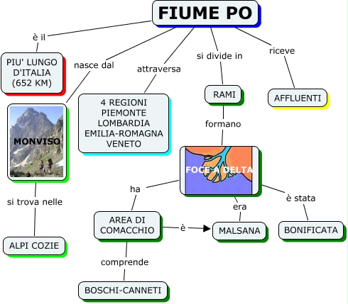 Questa Cmap, creata con IHMC CmapTools, contiene informazioni relative a: FIUME PO, AREA DI COMACCHIO è MALSANA, FOCE A DELTA ha AREA DI COMACCHIO, FIUME PO è il PIU' LUNGO D'ITALIA (652 KM), FIUME PO nasce dal MONVISO, FOCE A DELTA è stata BONIFICATA, RAMI formano FOCE A DELTA, MONVISO si trova nelle ALPI COZIE, FIUME PO si divide in RAMI, FIUME PO attraversa 4 REGIONI PIEMONTE LOMBARDIA EMILIA-ROMAGNA VENETO, FIUME PO riceve AFFLUENTI, FOCE A DELTA era MALSANA, AREA DI COMACCHIO comprende BOSCHI-CANNETI