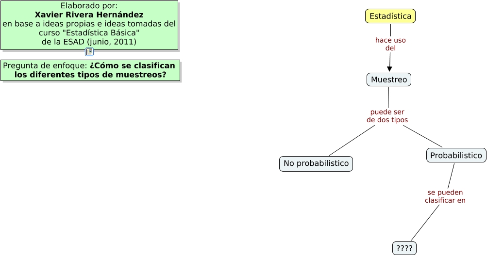 Este Cmap, tiene información relacionada con: Tipos de muestreo, Muestreo puede ser de dos tipos No probabilistico, Probabilistico se pueden clasificar en ????, Muestreo puede ser de dos tipos Probabilistico, Estadística hace uso del Muestreo