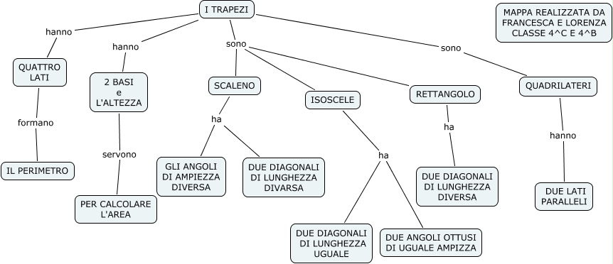 Questa Cmap, creata con IHMC CmapTools, contiene informazioni relative a: TRAPEZI_francesca_lorenza, I TRAPEZI sono ISOSCELE, RETTANGOLO ha DUE DIAGONALI DI LUNGHEZZA DIVERSA, I TRAPEZI hanno QUATTRO LATI, I TRAPEZI sono SCALENO, SCALENO ha GLI ANGOLI DI AMPIEZZA DIVERSA, I TRAPEZI sono RETTANGOLO, ISOSCELE ha DUE DIAGONALI DI LUNGHEZZA UGUALE, QUATTRO LATI formano IL PERIMETRO, 2 BASI e L'ALTEZZA servono PER CALCOLARE L'AREA, I TRAPEZI hanno 2 BASI e L'ALTEZZA, I TRAPEZI sono QUADRILATERI, QUADRILATERI hanno DUE LATI PARALLELI, ISOSCELE ha DUE ANGOLI OTTUSI DI UGUALE AMPIZZA, SCALENO ha DUE DIAGONALI DI LUNGHEZZA DIVARSA