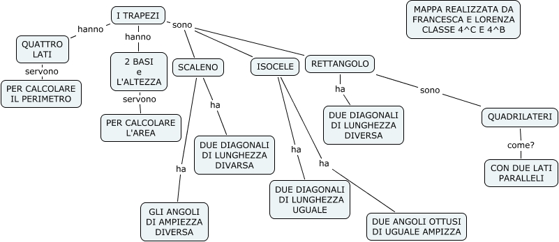 Questa Cmap, creata con IHMC CmapTools, contiene informazioni relative a: 2°TRAPEZI, RETTANGOLO ha DUE DIAGONALI DI LUNGHEZZA DIVERSA, I TRAPEZI sono SCALENO, 2 BASI e L'ALTEZZA servono PER CALCOLARE L'AREA, RETTANGOLO sono QUADRILATERI, I TRAPEZI hanno QUATTRO LATI, I TRAPEZI sono ISOCELE, I TRAPEZI hanno 2 BASI e L'ALTEZZA, QUATTRO LATI servono PER CALCOLARE IL PERIMETRO, ISOCELE ha DUE DIAGONALI DI LUNGHEZZA UGUALE, I TRAPEZI sono RETTANGOLO, SCALENO ha GLI ANGOLI DI AMPIEZZA DIVERSA, QUADRILATERI come? CON DUE LATI PARALLELI, ISOCELE ha DUE ANGOLI OTTUSI DI UGUALE AMPIZZA, SCALENO ha DUE DIAGONALI DI LUNGHEZZA DIVARSA