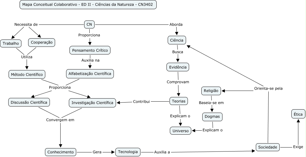 This Concept Map, created with IHMC CmapTools, has information related to: CN342, Religião Baseia-se em Dogmas, Pensamento Crítico Auxilia na Alfabetização Científica, Sociedade Orienta-se pela Ciência, Sociedade Exige Ética, Dogmas Explicam o Universo, Tecnologia Auxilia a Sociedade, Conhecimento Gera Tecnologia, Trabalho Utiliza Método Científico, CN Necessita de Trabalho, Discussão Científica Convergem em Conhecimento, CN Proporciona Pensamento Crítico, CN Necessita de Cooperação, Método Científico Proporciona Discussão Científica, Sociedade Orienta-se pela Religião, Alfabetização Científica Proporciona Discussão Científica, CN Aborda Ciência, Teorias Contribui Investigação Científica, Investigação Científica Convergem em Conhecimento, Evidência Comprovam Teorias, Teorias Explicam o Universo