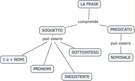 Questa Cmap, creata con IHMC CmapTools, contiene informazioni relative a: LA FRASE, LA FRASE comprende PREDICATO, SOGGETTO può essere SOTTOINTESO, SOGGETTO può essere INESISTENTE, LA FRASE comprende SOGGETTO, SOGGETTO può essere 1 o + NOMI, SOGGETTO può essere PRONOMI, PREDICATO può essere NOMINALE