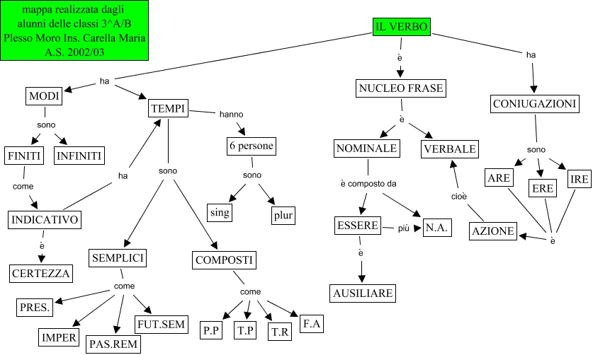 Questa Cmap, creata con IHMC CmapTools, contiene informazioni relative a: VERBO_MORO, IL VERBO ha MODI, CONIUGAZIONI sono IRE, COMPOSTI come F.A, ARE è AZIONE, SEMPLICI come IMPER, TEMPI hanno 6 persone, ESSERE è AUSILIARE, NUCLEO FRASE è NOMINALE, INDICATIVO è CERTEZZA, CONIUGAZIONI sono ARE, COMPOSTI come T.R, COMPOSTI come P.P, SEMPLICI come PAS.REM, 6 persone sono plur, ESSERE più N.A., IL VERBO è NUCLEO FRASE, IRE è AZIONE, INDICATIVO ha TEMPI, SEMPLICI come FUT.SEM, TEMPI sono COMPOSTI