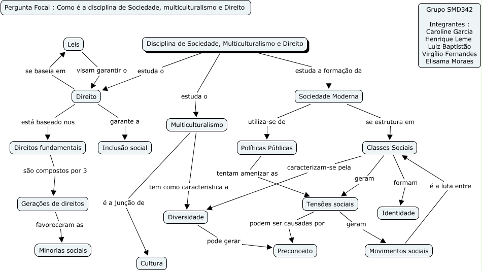 This Concept Map, created with IHMC CmapTools, has information related to: SMD342, Disciplina de Sociedade, Multiculturalismo e Direito estuda o Multiculturalismo, Multiculturalismo é a junção de Cultura, Sociedade Moderna se estrutura em Classes Sociais, Tensões sociais podem ser causadas por Preconceito, Movimentos sociais é a luta entre Classes Sociais, Disciplina de Sociedade, Multiculturalismo e Direito estuda a formação da Sociedade Moderna, Leis visam garantir o Direito, Classes Sociais caracterizam-se pela Diversidade, Gerações de direitos favoreceram as Minorias sociais, Sociedade Moderna utiliza-se de Políticas Públicas, Classes Sociais formam Identidade, Tensões sociais geram Movimentos sociais, Diversidade pode gerar Preconceito, Disciplina de Sociedade, Multiculturalismo e Direito estuda o Direito, Políticas Públicas tentam amenizar as Tensões sociais, Direito se baseia em Leis, Direito garante a Inclusão social, Classes Sociais geram Tensões sociais, Direito está baseado nos Direitos fundamentais, Multiculturalismo tem como caracteristica a Diversidade
