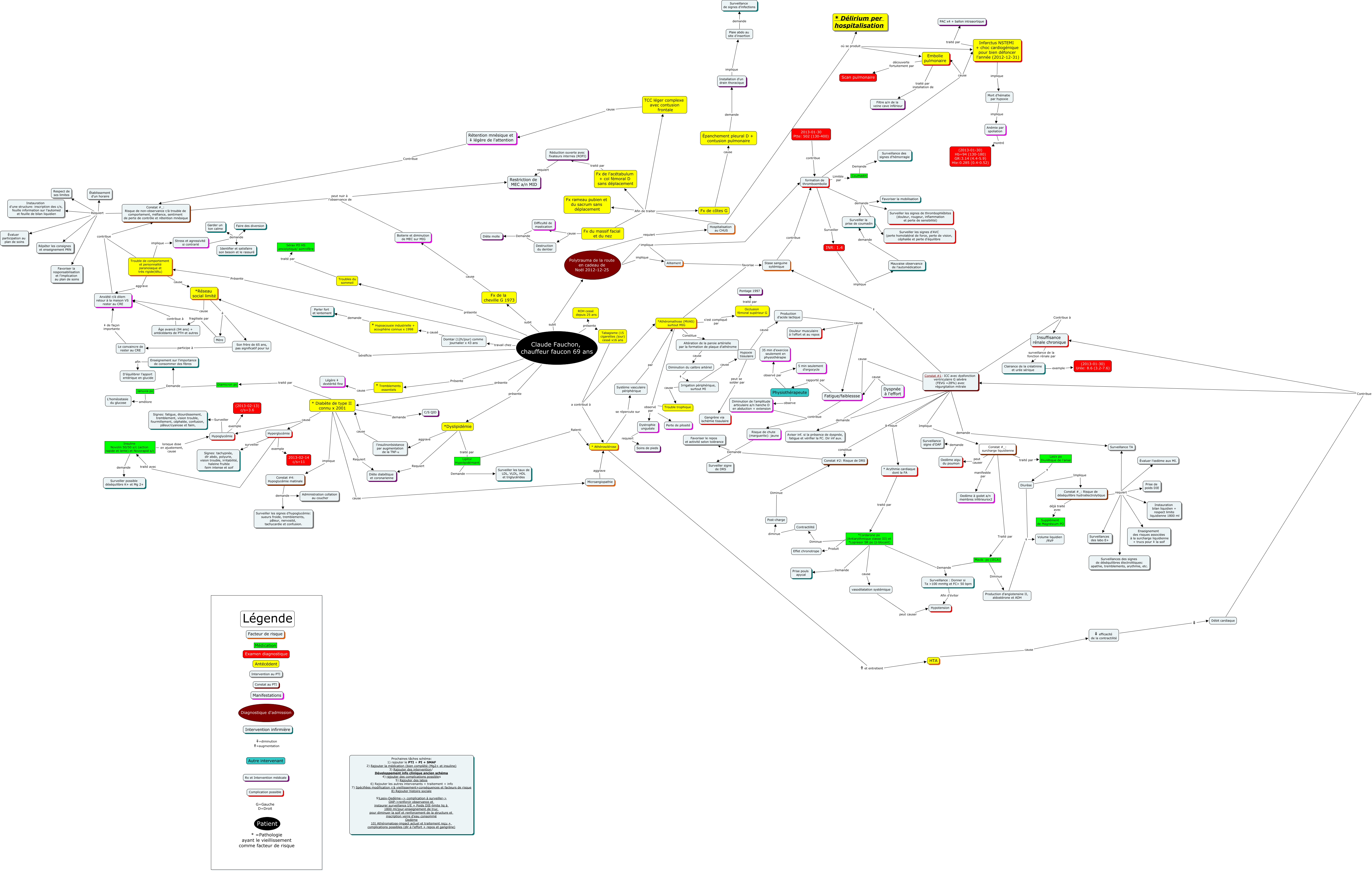 Cette carte de concepts créée avec IHMC CmapTools traite de: Claude Fauchon chauffeur faucon, Constat #_: Risque de déséquilibre hydroélectrolytique déjà traité avec Supplément de Magnésium PO, Diurèse Implique Constat #_: Risque de déséquilibre hydroélectrolytique, Mavik po (IECA) Demande Surveillance : Donner si Ta mmHg et FC> 50 bpm, Constat #2: Risque de DRS Demande Favoriser le repos et activité selon tolérance, *Athéromathose (MVAS) surtout MIG observé par Dystrophie unguéale, * Diabète de type II connu x 2001 implique Constat #4: Hypoglycémie matinale, Tabagisme (15 cigarettes /jour) cessé x16 ans a contribué à * Athérosclérose, Constat #1: ICC avec dysfonction ventriculaire G sévère (FEVG =28%) avec régurgitation mitrale demande Surveillance TA, Alitement implique formation de thromboembolie, Hyperglycémie traité avec Insuline Novolin 50/50 s/c (action rapide et lente) et Novorapid s/c, * Diabète de type II connu x 2001 Requiert Diète diabétique et coronarienne, *Cordarone po (Antiarythmique classe III) et *Lopresor SR po (β-blocant) Demande Surveillance : Donner si Ta mmHg et FC> 50 bpm, Dyspnée à l'effort cause Fatigue/faiblessse, Fatigue/faiblessse rapporté par Physiothérapeute, Insuline Novolin 50/50 s/c (action rapide et lente) et Novorapid s/c lorsque dose en ajustement, cause Hypoglycémie, * Tremblements essentiels cause Légère ⇓ dextérité fine, *Dyslipidémie aggrave l'insulinorésistance par augmentation de la TNF-α, Constat #_: Risque de déséquilibre hydroélectrolytique requiert Prise de poids DIE, *Cordarone po (Antiarythmique classe III) et *Lopresor SR po (β-blocant) Demande Prise pouls apycal, * Arythmie cardiaque dont la FA traité par *Cordarone po (Antiarythmique classe III) et *Lopresor SR po (β-blocant)