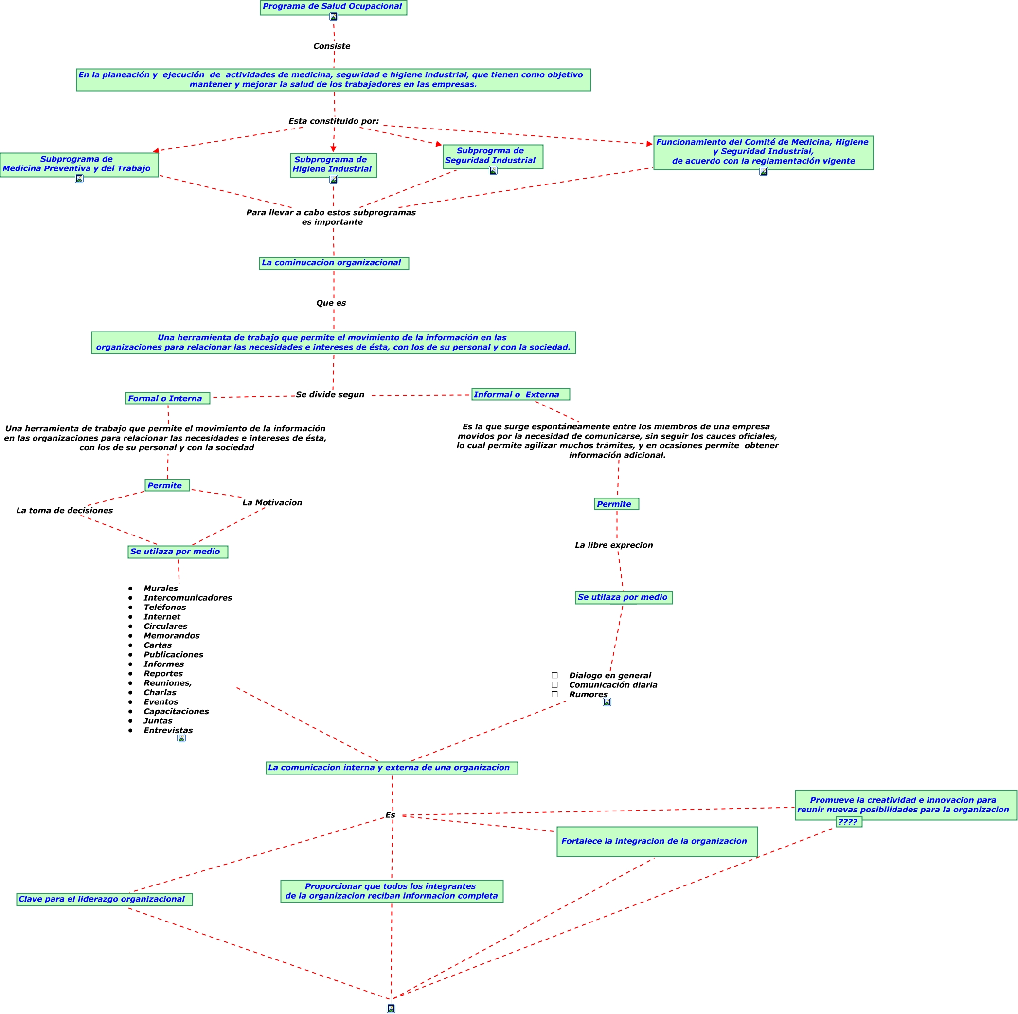 Este Cmap, tiene información relacionada con: Comunicacion en organizaciones, Proporcionar que todos los integrantes de la organizacion reciban informacion completa Clave para el liderazgo organizacional, La comunicacion interna y externa de una organizacion Dialogo en general Comunicación diaria Rumores ????, Permite La toma de decisiones Se utilaza por medio, Proporcionar que todos los integrantes de la organizacion reciban informacion completa ????, En la planeación y ejecución de actividades de medicina, seguridad e higiene industrial, que tienen como objetivo mantener y mejorar la salud de los trabajadores en las empresas. Esta constituido por: Subprograma de Higiene Industrial, Se utilaza por medio • Murales • Intercomunicadores • Teléfonos • Internet • Circulares • Memorandos • Cartas • Publicaciones • Informes • Reportes • Reuniones, • Charlas • Eventos • Capacitaciones • Juntas • Entrevistas La comunicacion interna y externa de una organizacion, La comunicacion interna y externa de una organizacion Es Clave para el liderazgo organizacional, Subprograma de Higiene Industrial Para llevar a cabo estos subprogramas es importante Subprogrma de Seguridad Industrial, Subprograma de Higiene Industrial Para llevar a cabo estos subprogramas es importante La cominucacion organizacional, Informal o Externa Es la que surge espontáneamente entre los miembros de una empresa movidos por la necesidad de comunicarse, sin seguir los cauces oficiales, lo cual permite agilizar muchos trámites, y en ocasiones permite obtener información adicional. Permite, La cominucacion organizacional Que es Una herramienta de trabajo que permite el movimiento de la información en las organizaciones para relacionar las necesidades e intereses de ésta, con los de su personal y con la sociedad., En la planeación y ejecución de actividades de medicina, seguridad e higiene industrial, que tienen como objetivo mantener y mejorar la salud de los trabajadores en las empresas. Esta constituido por: Subprogrma de Seguridad Industrial, Una herramienta de trabajo que permite el movimiento de la información en las organizaciones para relacionar las necesidades e intereses de ésta, con los de su personal y con la sociedad. Se divide segun Formal o Interna, La comunicacion interna y externa de una organizacion Es Fortalece la integracion de la organizacion, Subprograma de Higiene Industrial Para llevar a cabo estos subprogramas es importante Funcionamiento del Comité de Medicina, Higiene y Seguridad Industrial, de acuerdo con la reglamentación vigente, La comunicacion interna y externa de una organizacion Es Promueve la creatividad e innovacion para reunir nuevas posibilidades para la organizacion, Permite Una herramienta de trabajo que permite el movimiento de la información en las organizaciones para relacionar las necesidades e intereses de ésta, con los de su personal y con la sociedad Formal o Interna, Permite La libre exprecion Se utilaza por medio, Proporcionar que todos los integrantes de la organizacion reciban informacion completa Fortalece la integracion de la organizacion, La comunicacion interna y externa de una organizacion Es Proporcionar que todos los integrantes de la organizacion reciban informacion completa
