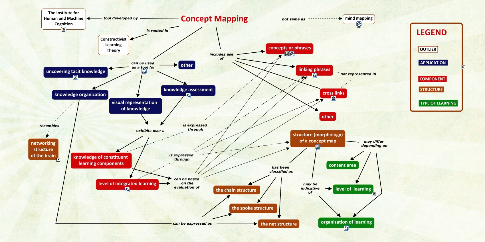 This Concept Map, created with IHMC CmapTools, has information related to: Viktoria_CMapping, structure (morphology) of a concept map has been classified as the spoke structure, knowledge of constituent learning components can be based on the evaluation of cross links, knowledge assessment exhibits user's knowledge of constituent learning components, knowledge of constituent learning components can be based on the evaluation of structure (morphology) of a concept map, structure (morphology) of a concept map may be indicative of level of learning, visual representation of knowledge exhibits user's knowledge of constituent learning components, level of integrated learning is expressed through linking phrases, cross links not represented in mind mapping, knowledge organization resembles networking structure of the brain, structure (morphology) of a concept map may differ depending on level of learning, linking phrases not represented in mind mapping, structure (morphology) of a concept map has been classified as the net structure, Concept Mapping not same as mind mapping, level of integrated learning can be based on the evaluation of linking phrases, knowledge organization can be expressed as the net structure, level of integrated learning can be based on the evaluation of cross links, structure (morphology) of a concept map has been classified as the chain structure, level of integrated learning can be based on the evaluation of structure (morphology) of a concept map, Concept Mapping includes use of other, Concept Mapping can be used as a tool for knowledge assessment