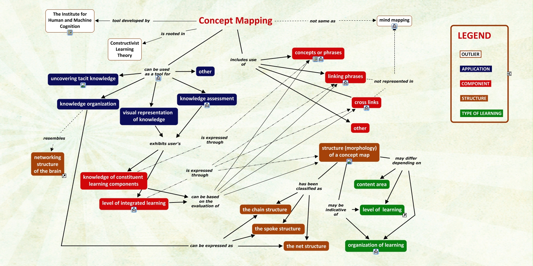 This Concept Map, created with IHMC CmapTools, has information related to: october_test, structure (morphology) of a concept map has been classified as the spoke structure, knowledge of constituent learning components can be based on the evaluation of cross links, knowledge assessment exhibits user's knowledge of constituent learning components, knowledge of constituent learning components can be based on the evaluation of structure (morphology) of a concept map, structure (morphology) of a concept map may be indicative of level of learning, visual representation of knowledge exhibits user's knowledge of constituent learning components, level of integrated learning is expressed through linking phrases, cross links not represented in mind mapping, knowledge organization resembles networking structure of the brain, structure (morphology) of a concept map may differ depending on level of learning, linking phrases not represented in mind mapping, structure (morphology) of a concept map has been classified as the net structure, Concept Mapping not same as mind mapping, level of integrated learning can be based on the evaluation of linking phrases, knowledge organization can be expressed as the net structure, level of integrated learning can be based on the evaluation of cross links, structure (morphology) of a concept map has been classified as the chain structure, level of integrated learning can be based on the evaluation of structure (morphology) of a concept map, Concept Mapping includes use of other, Concept Mapping can be used as a tool for knowledge assessment