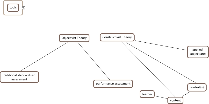 This Concept Map, created with IHMC CmapTools, has information related to: mind_map, Constructivist Theory content, traditional standardized assessment Objectivist Theory, learner content, Objectivist Theory performance assessment, content context(s), Constructivist Theory applied subject ares, Constructivist Theory context(s)