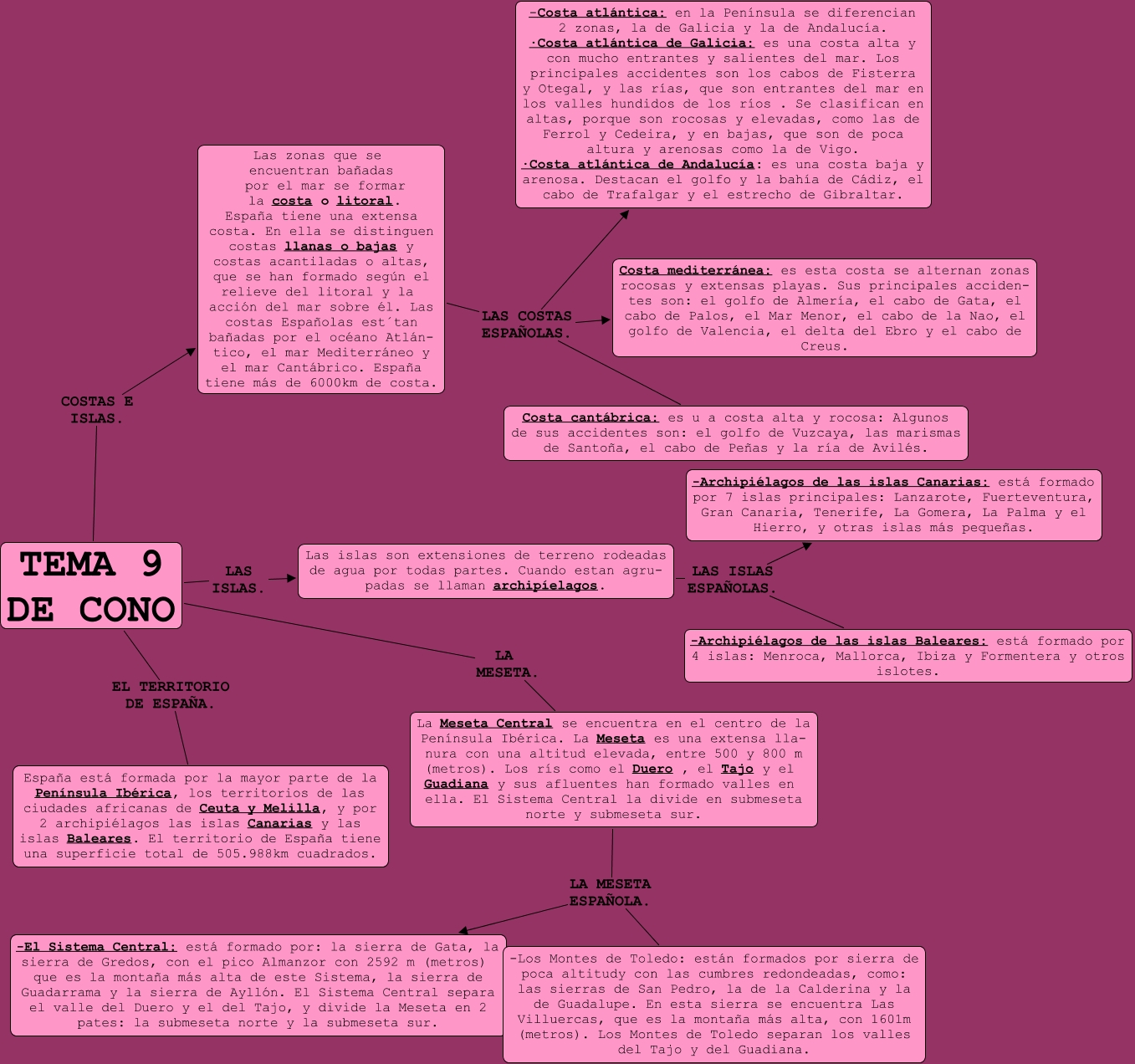 Este Cmap, tiene información relacionada con: LYDIA, Las zonas que se encuentran bañadas por el mar se formar la costa o litoral. España tiene una extensa costa. En ella se distinguen costas llanas o bajas y costas acantiladas o altas, que se han formado según el relieve del litoral y la acción del mar sobre él. Las costas Españolas est´tan bañadas por el océano Atlán- tico, el mar Mediterráneo y el mar Cantábrico. España tiene más de 6000km de costa. LAS COSTAS ESPAÑOLAS. Costa mediterránea: es esta costa se alternan zonas rocosas y extensas playas. Sus principales acciden- tes son: el golfo de Almería, el cabo de Gata, el cabo de Palos, el Mar Menor, el cabo de la Nao, el golfo de Valencia, el delta del Ebro y el cabo de Creus., Las zonas que se encuentran bañadas por el mar se formar la costa o litoral. España tiene una extensa costa. En ella se distinguen costas llanas o bajas y costas acantiladas o altas, que se han formado según el relieve del litoral y la acción del mar sobre él. Las costas Españolas est´tan bañadas por el océano Atlán- tico, el mar Mediterráneo y el mar Cantábrico. España tiene más de 6000km de costa. LAS COSTAS ESPAÑOLAS. Costa cantábrica: es u a costa alta y rocosa: Algunos de sus accidentes son: el golfo de Vuzcaya, las marismas de Santoña, el cabo de Peñas y la ría de Avilés., TEMA 9 DE CONO LA MESETA. La Meseta Central se encuentra en el centro de la Península Ibérica. La Meseta es una extensa lla- nura con una altitud elevada, entre 500 y 800 m (metros). Los rís como el Duero , el Tajo y el Guadiana y sus afluentes han formado valles en ella. El Sistema Central la divide en submeseta norte y submeseta sur., TEMA 9 DE CONO COSTAS E ISLAS. Las zonas que se encuentran bañadas por el mar se formar la costa o litoral. España tiene una extensa costa. En ella se distinguen costas llanas o bajas y costas acantiladas o altas, que se han formado según el relieve del litoral y la acción del mar sobre él. Las costas Españolas est´tan bañadas por el océano Atlán- tico, el mar Mediterráneo y el mar Cantábrico. España tiene más de 6000km de costa., Las islas son extensiones de terreno rodeadas de agua por todas partes. Cuando estan agru- padas se llaman archipíelagos. LAS ISLAS ESPAÑOLAS. -Archipiélagos de las islas Baleares: está formado por 4 islas: Menroca, Mallorca, Ibiza y Formentera y otros islotes., La Meseta Central se encuentra en el centro de la Península Ibérica. La Meseta es una extensa lla- nura con una altitud elevada, entre 500 y 800 m (metros). Los rís como el Duero , el Tajo y el Guadiana y sus afluentes han formado valles en ella. El Sistema Central la divide en submeseta norte y submeseta sur. LA MESETA ESPAÑOLA. -El Sistema Central: está formado por: la sierra de Gata, la sierra de Gredos, con el pico Almanzor con 2592 m (metros) que es la montaña más alta de este Sistema, la sierra de Guadarrama y la sierra de Ayllón. El Sistema Central separa el valle del Duero y el del Tajo, y divide la Meseta en 2 pates: la submeseta norte y la submeseta sur., Las zonas que se encuentran bañadas por el mar se formar la costa o litoral. España tiene una extensa costa. En ella se distinguen costas llanas o bajas y costas acantiladas o altas, que se han formado según el relieve del litoral y la acción del mar sobre él. Las costas Españolas est´tan bañadas por el océano Atlán- tico, el mar Mediterráneo y el mar Cantábrico. España tiene más de 6000km de costa. LAS COSTAS ESPAÑOLAS. -Costa atlántica: en la Península se diferencian 2 zonas, la de Galicia y la de Andalucía. ·Costa atlántica de Galicia: es una costa alta y con mucho entrantes y salientes del mar. Los principales accidentes son los cabos de Fisterra y Otegal, y las rías, que son entrantes del mar en los valles hundidos de los ríos . Se clasifican en altas, porque son rocosas y elevadas, como las de Ferrol y Cedeira, y en bajas, que son de poca altura y arenosas como la de Vigo. ·Costa atlántica de Andalucía: es una costa baja y arenosa. Destacan el golfo y la bahía de Cádiz, el cabo de Trafalgar y el estrecho de Gibraltar., TEMA 9 DE CONO LAS ISLAS. Las islas son extensiones de terreno rodeadas de agua por todas partes. Cuando estan agru- padas se llaman archipíelagos., Las islas son extensiones de terreno rodeadas de agua por todas partes. Cuando estan agru- padas se llaman archipíelagos. LAS ISLAS ESPAÑOLAS. -Archipiélagos de las islas Canarias: está formado por 7 islas principales: Lanzarote, Fuerteventura, Gran Canaria, Tenerife, La Gomera, La Palma y el Hierro, y otras islas más pequeñas., La Meseta Central se encuentra en el centro de la Península Ibérica. La Meseta es una extensa lla- nura con una altitud elevada, entre 500 y 800 m (metros). Los rís como el Duero , el Tajo y el Guadiana y sus afluentes han formado valles en ella. El Sistema Central la divide en submeseta norte y submeseta sur. LA MESETA ESPAÑOLA. -Los Montes de Toledo: están formados por sierra de poca altitudy con las cumbres redondeadas, como: las sierras de San Pedro, la de la Calderina y la de Guadalupe. En esta sierra se encuentra Las Villuercas, que es la montaña más alta, con 1601m (metros). Los Montes de Toledo separan los valles del Tajo y del Guadiana., TEMA 9 DE CONO EL TERRITORIO DE ESPAÑA. España está formada por la mayor parte de la Península Ibérica, los territorios de las ciudades africanas de Ceuta y Melilla, y por 2 archipiélagos las islas Canarias y las islas Baleares. El territorio de España tiene una superficie total de 505.988km cuadrados.