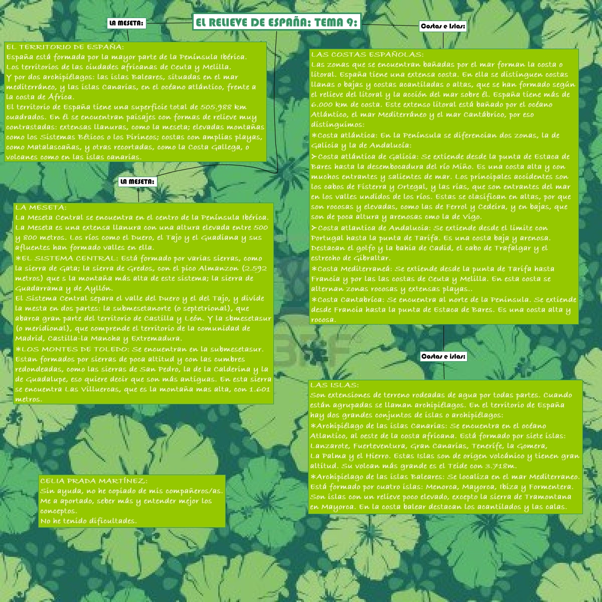 Este Cmap, tiene información relacionada con: Cono tema 9 por celia, EL RELIEVE DE ESPAÑA; TEMA 9: Costas e Islas: LAS COSTAS ESPAÑOLAS: Las zonas que se encuentran bañadas por el mar forman la costa o litoral. España tiene una extensa costa. En ella se distinguen costas llanas o bajas y costas acantiladas o altas, que se han formado según el relieve del litoral y la acción del mar sobre él. España tiene más de 6.000 km de costa. Este extenso litoral está bañado por el océano Atlántico, el mar Mediterráneo y el mar Cantábrico, por eso distinguimos: ∗Costa atlántica: En la Península se diferencian dos zonas, la de Galicia y la de Andalucía: ≻Costa atlántica de Galicia: Se extiende desde la punta de Estaca de Bares hasta la desembocadura del río Miño. Es una costa alta y con muchos entrantes y salientes de mar. Los principales accidentes son los cabos de Fisterra y Ortegal, y las rias, que son entrantes del mar en los valles undidos de los ríos. Estas se clasifican en altas, por que son rocosas y elevadas, como las de Ferrol y Cedeira, y en bajas, que son de poca altura y arenosas cmo la de Vigo. ≻Costa atlantica de Andalucia: Se extiende desde el limite con Portugal hasta la punta de Tarifa. Es una costa baja y arenosa. Destacan el golfo y la bahia de Cadid, el cabo de Trafalgar y el estrecho de Gibraltar. ∗Costa Mediterraneá: Se extiende desde la punta de Tarifa hasta Francia y por las las costas de Ceuta y Melilla. En esta costa se alternan zonas rocosas y extensas playas.. ∗Costa Cantabríca: Se encuentra al norte de la Peninsula. Se extiende desde Francia hasta la punta de Estaca de Bares. Es una costa alta y rocosa., EL RELIEVE DE ESPAÑA; TEMA 9: LA MESETA: EL TERRITORIO DE ESPAÑA: España está formada por la mayor parte de la Península Ibérica. Los territorios de las ciudades africanas de Ceuta y Melilla. Y por dos archipiélagos: las islas Baleares, situadas en el mar mediterráneo, y las islas Canarias, en el océano atlántico, frente a la costa de África. El territorio de España tiene una superficie total de 505.988 km cuadrados. En él se encuentran paisajes con formas de relieve muy contrastadas: extensas llanuras, como la meseta; elevadas montañas como los Sistemas Béticos o los Pirineos; costas con amplias playas, como Matalascañas, y otras recortadas, como la Costa Gallega, o volcanes como en las islas canarias., LAS COSTAS ESPAÑOLAS: Las zonas que se encuentran bañadas por el mar forman la costa o litoral. España tiene una extensa costa. En ella se distinguen costas llanas o bajas y costas acantiladas o altas, que se han formado según el relieve del litoral y la acción del mar sobre él. España tiene más de 6.000 km de costa. Este extenso litoral está bañado por el océano Atlántico, el mar Mediterráneo y el mar Cantábrico, por eso distinguimos: ∗Costa atlántica: En la Península se diferencian dos zonas, la de Galicia y la de Andalucía: ≻Costa atlántica de Galicia: Se extiende desde la punta de Estaca de Bares hasta la desembocadura del río Miño. Es una costa alta y con muchos entrantes y salientes de mar. Los principales accidentes son los cabos de Fisterra y Ortegal, y las rias, que son entrantes del mar en los valles undidos de los ríos. Estas se clasifican en altas, por que son rocosas y elevadas, como las de Ferrol y Cedeira, y en bajas, que son de poca altura y arenosas cmo la de Vigo. ≻Costa atlantica de Andalucia: Se extiende desde el limite con Portugal hasta la punta de Tarifa. Es una costa baja y arenosa. Destacan el golfo y la bahia de Cadid, el cabo de Trafalgar y el estrecho de Gibraltar. ∗Costa Mediterraneá: Se extiende desde la punta de Tarifa hasta Francia y por las las costas de Ceuta y Melilla. En esta costa se alternan zonas rocosas y extensas playas.. ∗Costa Cantabríca: Se encuentra al norte de la Peninsula. Se extiende desde Francia hasta la punta de Estaca de Bares. Es una costa alta y rocosa. Costas e islas: LAS ISLAS: Son extensiones de terreno rodeadas de agua por todas partes. Cuando están agrupadas se llaman archipiélagos. En el territorio de España hay dos grandes conjuntos de islas o archipiélagos: ∗Archipiélago de las islas Canarias: Se encuentra en el océano Atlantico, al oeste de la costa africana. Está formado por siete islas: Lanzarote, Fuerteventura, Gran Canarias, Tenerífe, la Gomera, La Palma y el Hierro. Estas Islas son de origen volcánico y tienen gran altitud. Su volcan más grande es el Teide con 3.718m. ∗Archipielago de las islas Baleares: Se localiza en el mar Mediterraneo. Está formado por cuatro islas: Menorca, Mayorca, Ibiza y Formentera. Son islas con un relieve poco elevado, excepto la sierra de Tramontana en Mayorca. En la costa balear destacan los acantilados y las calas., EL RELIEVE DE ESPAÑA; TEMA 9: LA MESETA: LA MESETA: La Meseta Central se encuentra en el centro de la Península Ibérica. La Meseta es una extensa llanura con una altura elevada entre 500 y 800 metros. Los ríos como el Duero, el Tajo y el Guadiana y sus afluentes han formado valles en ella. ∗EL SISTEMA CENTRAL: Está formado por varias sierras, como la sierra de Gata; la sierra de Gredos, con el pico Almanzon (2.592 metros) que s la montaña más alta de este sistema; la sierra de Guadarrama y de Ayllón. El Sistema Central separa el valle del Duero y el del Tajo, y divide la mesta en dos partes: la submesetanorte (o septetrional), que abarca gran parte del territorio de Castilla y León. Y la sbmesetasur (o meridional), que comprende el territorio de la comunidad de Madrid, Castilla-la Mancha y Extremadura. ∗LOS MONTES DE TOLEDO: Se encuentran en la submesetasur. Estan formados por sierras de poca altitud y con las cumbres redondeadas, como las sierras de San Pedro, la de la Calderina y la de Guadalupe, eso quiere decir que son más antiguas. En esta sierra se encuentra Las Villuercas, que es la montaña mas alta, con 1.601 metros.