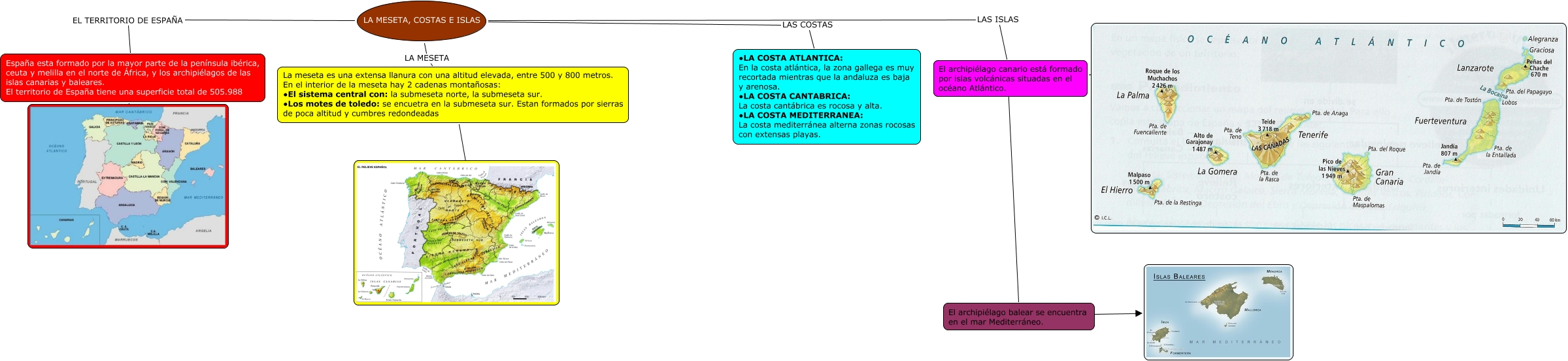 Este Cmap, tiene información relacionada con: valeria meseta costas e islas tema 9, LA MESETA, COSTAS E ISLAS LAS ISLAS El archipiélago canario está formado por islas volcánicas situadas en el océano Atlántico., LA MESETA, COSTAS E ISLAS LAS COSTAS ∙LA COSTA ATLANTICA: En la costa atlántica, la zona gallega es muy recortada mientras que la andaluza es baja y arenosa. ∙LA COSTA CANTABRICA: La costa cantábrica es rocosa y alta. ∙LA COSTA MEDITERRANEA: La costa mediterránea alterna zonas rocosas con extensas playas., LA MESETA, COSTAS E ISLAS EL TERRITORIO DE ESPAÑA España esta formado por la mayor parte de la península ibérica, ceuta y melilla en el norte de África, y los archipiélagos de las islas canarias y baleares. El territorio de España tiene una superficie total de 505.988, El archipiélago balear se encuentra en el mar Mediterráneo. ????, LA MESETA, COSTAS E ISLAS LA MESETA La meseta es una extensa llanura con una altitud elevada, entre 500 y 800 metros. En el interior de la meseta hay 2 cadenas montañosas: ∙El sistema central con: la submeseta norte, la submeseta sur. ∙Los motes de toledo: se encuetra en la submeseta sur. Estan formados por sierras de poca altitud y cumbres redondeadas, El archipiélago canario está formado por islas volcánicas situadas en el océano Atlántico. ???? El archipiélago balear se encuentra en el mar Mediterráneo., La meseta es una extensa llanura con una altitud elevada, entre 500 y 800 metros. En el interior de la meseta hay 2 cadenas montañosas: ∙El sistema central con: la submeseta norte, la submeseta sur. ∙Los motes de toledo: se encuetra en la submeseta sur. Estan formados por sierras de poca altitud y cumbres redondeadas ????, España esta formado por la mayor parte de la península ibérica, ceuta y melilla en el norte de África, y los archipiélagos de las islas canarias y baleares. El territorio de España tiene una superficie total de 505.988 ????, El archipiélago canario está formado por islas volcánicas situadas en el océano Atlántico. ????