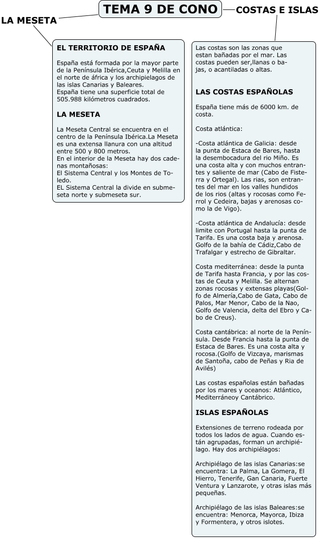 Este Cmap, tiene información relacionada con: tame9conoalejandro, TEMA 9 DE CONO LA MESETA EL TERRITORIO DE ESPAÑA España está formada por la mayor parte de la Península Ibérica,Ceuta y Melilla en el norte de áfrica y los archipielagos de las islas Canarias y Baleares. España tiene una superficie total de 505.988 kilómetros cuadrados. LA MESETA La Meseta Central se encuentra en el centro de la Península Ibérica.La Meseta es una extensa llanura con una altitud entre 500 y 800 metros. En el interior de la Meseta hay dos cade- nas montañosas: El Sistema Central y los Montes de To- ledo. EL Sistema Central la divide en subme- seta norte y submeseta sur., TEMA 9 DE CONO COSTAS E ISLAS Las costas son las zonas que estan bañadas por el mar. Las costas pueden ser,llanas o ba- jas, o acantiladas o altas. LAS COSTAS ESPAÑOLAS España tiene más de 6000 km. de costa. Costa atlántica: -Costa atlántica de Galicia: desde la punta de Estaca de Bares, hasta la desembocadura del rio Miño. Es una costa alta y con muchos entran- tes y saliente de mar (Cabo de Fiste- rra y Ortegal). Las rias, son entran- tes del mar en los valles hundidos de los rios (altas y rocosas como Fe- rrol y Cedeira, bajas y arenosas co- mo la de Vigo). -Costa atlántica de Andalucía: desde limite con Portugal hasta la punta de Tarifa. Es una costa baja y arenosa. Golfo de la bahía de Cádiz,Cabo de Trafalgar y estrecho de Gibraltar. Costa mediterránea: desde la punta de Tarifa hasta Francia, y por las cos- tas de Ceuta y Melilla. Se alternan zonas rocosas y extensas playas(Gol- fo de Almería,Cabo de Gata, Cabo de Palos, Mar Menor, Cabo de la Nao, Golfo de Valencia, delta del Ebro y Ca- bo de Creus). Costa cantábrica: al norte de la Penín- sula. Desde Francia hasta la punta de Estaca de Bares. Es una costa alta y rocosa.(Golfo de Vizcaya, marismas de Santoña, cabo de Peñas y Ria de Avilés) Las costas españolas están bañadas por los mares y oceanos: Atlántico, Mediterráneoy Cantábrico. ISLAS ESPAÑOLAS Extensiones de terreno rodeada por todos los lados de agua. Cuando es- tán agrupadas, forman un archipié- lago. Hay dos archipiélagos: Archipiélago de las islas Canarias:se encuentra: La Palma, La Gomera, El Hierro, Tenerife, Gan Canaria, Fuerte Ventura y Lanzarote, y otras islas más pequeñas. Archipiélago de las islas Baleares:se encuentra: Menorca, Mayorca, Ibiza y Formentera, y otros islotes.