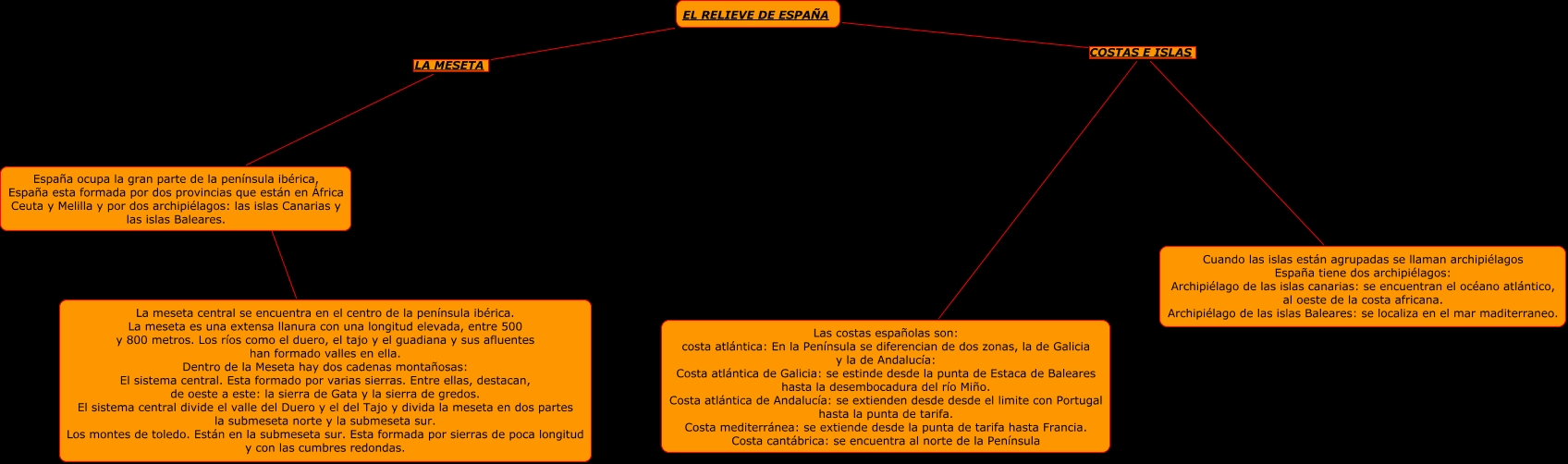 Este Cmap, tiene información relacionada con: TEMA 9 CONO SAMUEL, EL RELIEVE DE ESPAÑA COSTAS E ISLAS Las costas españolas son: costa atlántica: En la Península se diferencian de dos zonas, la de Galicia y la de Andalucía: Costa atlántica de Galicia: se estinde desde la punta de Estaca de Baleares hasta la desembocadura del río Miño. Costa atlántica de Andalucía: se extienden desde desde el limite con Portugal hasta la punta de tarifa. Costa mediterránea: se extiende desde la punta de tarifa hasta Francia. Costa cantábrica: se encuentra al norte de la Península, EL RELIEVE DE ESPAÑA LA MESETA España ocupa la gran parte de la península ibérica, España esta formada por dos provincias que están en África Ceuta y Melilla y por dos archipiélagos: las islas Canarias y las islas Baleares., EL RELIEVE DE ESPAÑA COSTAS E ISLAS Cuando las islas están agrupadas se llaman archipiélagos España tiene dos archipiélagos: Archipiélago de las islas canarias: se encuentran el océano atlántico, al oeste de la costa africana. Archipiélago de las islas Baleares: se localiza en el mar maditerraneo., España ocupa la gran parte de la península ibérica, España esta formada por dos provincias que están en África Ceuta y Melilla y por dos archipiélagos: las islas Canarias y las islas Baleares. ???? La meseta central se encuentra en el centro de la península ibérica. La meseta es una extensa llanura con una longitud elevada, entre 500 y 800 metros. Los ríos como el duero, el tajo y el guadiana y sus afluentes han formado valles en ella. Dentro de la Meseta hay dos cadenas montañosas: El sistema central. Esta formado por varias sierras. Entre ellas, destacan, de oeste a este: la sierra de Gata y la sierra de gredos. El sistema central divide el valle del Duero y el del Tajo y divida la meseta en dos partes la submeseta norte y la submeseta sur. Los montes de toledo. Están en la submeseta sur. Esta formada por sierras de poca longitud y con las cumbres redondas.