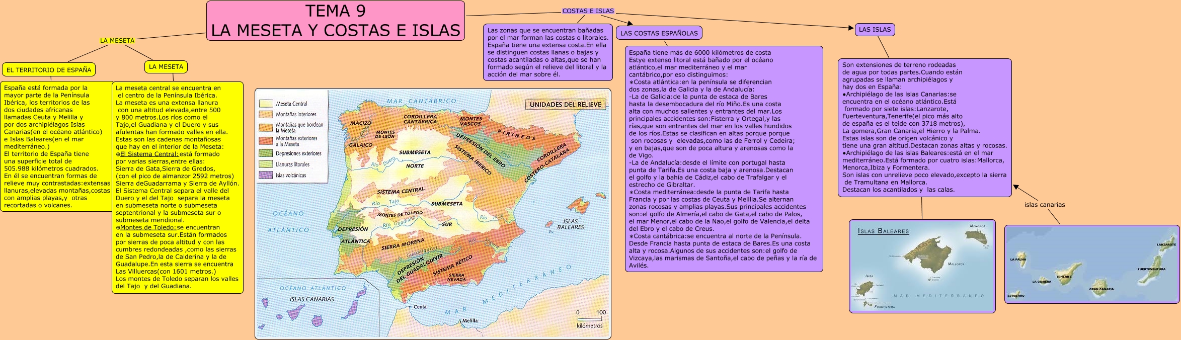 Este Cmap, tiene información relacionada con: tama 9 cono 1ª parte isabel, TEMA 9 LA MESETA Y COSTAS E ISLAS COSTAS E ISLAS Las zonas que se encuentran bañadas por el mar forman las costas o litorales. España tiene una extensa costa.En ella se distinguen costas llanas o bajas y costas acantiladas o altas,que se han formado según el relieve del litoral y la acción del mar sobre él., LAS COSTAS ESPAÑOLAS ???? España tiene más de 6000 kilómetros de costa Estye extenso litoral está bañado por el océano atlántico,el mar mediterráneo y el mar cantábrico,por eso distinguimos: ∗Costa atlántica:en la península se diferencian dos zonas,la de Galicia y la de Andalucía: -La de Galicia:de la punta de estaca de Bares hasta la desembocadura del río Miño.Es una costa alta con muchos salientes y entrantes del mar.Los principales accidentes son:Fisterra y Ortegal,y las rías,que son entrantes del mar en los valles hundidos de los ríos.Estas se clasifican en altas porque porque son rocosas y elevadas,como las de Ferrol y Cedeira; y en bajas,que son de poca altura y arenosas como la de Vigo. -La de Andalucía:desde el límite con portugal hasta punta de Tarifa.Es una costa baja y arenosa.Destacan el golfo y la bahía de Cádiz,el cabo de Trafalgar y el estrecho de Gibraltar. ∗Costa mediterránea:desde la punta de Tarifa hasta Francia y por las costas de Ceuta y Melilla.Se alternan zonas rocosas y amplias playas.Sus principales accidentes son:el golfo de Almería,el cabo de Gata,el cabo de Palos, el mar Menor,el cabo de la Nao,el golfo de Valencia,el delta del Ebro y el cabo de Creus. ∗Costa cantábrica:se encuentra al norte de la Península. Desde Francia hasta punta de estaca de Bares.Es una costa alta y rocosa.Algunos de sus accidentes son:el golfo de Vizcaya,las marismas de Santoña,el cabo de peñas y la ría de Avilés., TEMA 9 LA MESETA Y COSTAS E ISLAS LA MESETA EL TERRITORIO DE ESPAÑA, TEMA 9 LA MESETA Y COSTAS E ISLAS COSTAS E ISLAS LAS ISLAS, islas canarias Son extensiones de terreno rodeadas de agua por todas partes.Cuando están agrupadas se llaman archipiélagos y hay dos en España: ∙Archipiélago de las islas Canarias:se encuentra en el océano atlántico.Está formado por siete islas:Lanzarote, Fuerteventura,Tenerife(el pico más alto de españa es el teide con 3718 metros), La gomera,Gran Canaria,el Hierro y la Palma. Estas islas son de origen volcánico y tiene una gran altitud.Destacan zonas altas y rocosas. ∙Archipiélago de las islas Baleares:está en el mar mediterráneo.Está formado por cuatro islas:Mallorca, Menorca,Ibiza y Formentera. Son islas con unrelieve poco elevado,excepto la sierra de Tramultana en Mallorca. Destacan los acantilados y las calas., LA MESETA ???? La meseta central se encuentra en el centro de la Península Ibérica. La meseta es una extensa llanura con una altitud elevada,entre 500 y 800 metros.Los ríos como el Tajo,el Guadiana y el Duero y sus afulentas han formado valles en ella. Estas son las cadenas montañosas que hay en el interior de la Meseta: ⊕El Sistema Central:está formado por varias sierras,entre ellas: Sierra de Gata,Sierra de Gredos, (con el pico de almanzor 2592 metros) Sierra deGuadarrama y Sierra de Ayllón. El Sistema Central separa el valle del Duero y el del Tajo separa la meseta en submeseta norte o submeseta septentrional y la submeseta sur o submeseta meridional. ⊕Montes de Toledo:se encuentran en la submeseta sur.Están formados por sierras de poca altitud y con las cumbres redondeadas ,como las sierras de San Pedro,la de Calderina y la de Guadalupe.En esta sierra se encuentra Las Villuercas(con 1601 metros.) Los montes de Toledo separan los valles del Tajo y del Guadiana., LAS ISLAS ???? Son extensiones de terreno rodeadas de agua por todas partes.Cuando están agrupadas se llaman archipiélagos y hay dos en España: ∙Archipiélago de las islas Canarias:se encuentra en el océano atlántico.Está formado por siete islas:Lanzarote, Fuerteventura,Tenerife(el pico más alto de españa es el teide con 3718 metros), La gomera,Gran Canaria,el Hierro y la Palma. Estas islas son de origen volcánico y tiene una gran altitud.Destacan zonas altas y rocosas. ∙Archipiélago de las islas Baleares:está en el mar mediterráneo.Está formado por cuatro islas:Mallorca, Menorca,Ibiza y Formentera. Son islas con unrelieve poco elevado,excepto la sierra de Tramultana en Mallorca. Destacan los acantilados y las calas., EL TERRITORIO DE ESPAÑA ???? España está formada por la mayor parte de la Península Ibérica, los territorios de las dos ciudades africanas llamadas Ceuta y Melilla y por dos archipiélagos Islas Canarias(en el océano atlántico) e Islas Baleares(en el mar mediterráneo.) El territorio de España tiene una superficie total de 505.988 kilómetros cuadrados. En él se encuentran formas de relieve muy contrastadas:extensas llanuras,elevadas montañas,costas con amplias playas,y otras recortadas o volcanes., TEMA 9 LA MESETA Y COSTAS E ISLAS LA MESETA LA MESETA, TEMA 9 LA MESETA Y COSTAS E ISLAS COSTAS E ISLAS LAS COSTAS ESPAÑOLAS, ???? Son extensiones de terreno rodeadas de agua por todas partes.Cuando están agrupadas se llaman archipiélagos y hay dos en España: ∙Archipiélago de las islas Canarias:se encuentra en el océano atlántico.Está formado por siete islas:Lanzarote, Fuerteventura,Tenerife(el pico más alto de españa es el teide con 3718 metros), La gomera,Gran Canaria,el Hierro y la Palma. Estas islas son de origen volcánico y tiene una gran altitud.Destacan zonas altas y rocosas. ∙Archipiélago de las islas Baleares:está en el mar mediterráneo.Está formado por cuatro islas:Mallorca, Menorca,Ibiza y Formentera. Son islas con unrelieve poco elevado,excepto la sierra de Tramultana en Mallorca. Destacan los acantilados y las calas.