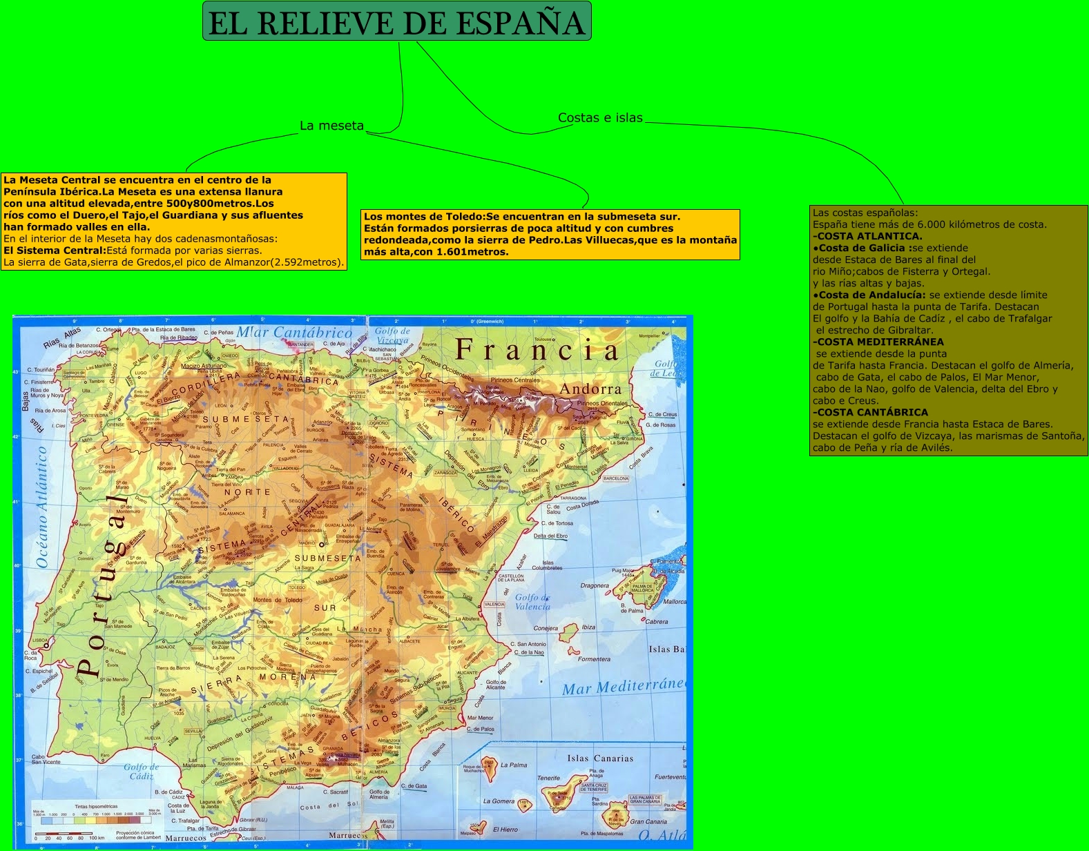 Este Cmap, tiene información relacionada con: ANDRES TEMA9 CONO, EL RELIEVE DE ESPAÑA Costas e islas Las costas españolas: España tiene más de 6.000 kilómetros de costa. -COSTA ATLANTICA. ∙Costa de Galicia :se extiende desde Estaca de Bares al final del rio Miño;cabos de Fisterra y Ortegal. y las rías altas y bajas. ∙Costa de Andalucía: se extiende desde límite de Portugal hasta la punta de Tarifa. Destacan El golfo y la Bahía de Cadíz , el cabo de Trafalgar el estrecho de Gibraltar. -COSTA MEDITERRÁNEA se extiende desde la punta de Tarifa hasta Francia. Destacan el golfo de Almería, cabo de Gata, el cabo de Palos, El Mar Menor, cabo de la Nao, golfo de Valencia, delta del Ebro y cabo e Creus. -COSTA CANTÁBRICA se extiende desde Francia hasta Estaca de Bares. Destacan el golfo de Vizcaya, las marismas de Santoña, cabo de Peña y ría de Avilés., EL RELIEVE DE ESPAÑA La meseta La Meseta Central se encuentra en el centro de la Península Ibérica.La Meseta es una extensa llanura con una altitud elevada,entre 500y800metros.Los ríos como el Duero,el Tajo,el Guardiana y sus afluentes han formado valles en ella. En el interior de la Meseta hay dos cadenasmontañosas: El Sistema Central:Está formada por varias sierras. La sierra de Gata,sierra de Gredos,el pico de Almanzor(2.592metros)., EL RELIEVE DE ESPAÑA La meseta Los montes de Toledo:Se encuentran en la submeseta sur. Están formados porsierras de poca altitud y con cumbres redondeada,como la sierra de Pedro.Las Villuecas,que es la montaña más alta,con 1.601metros.