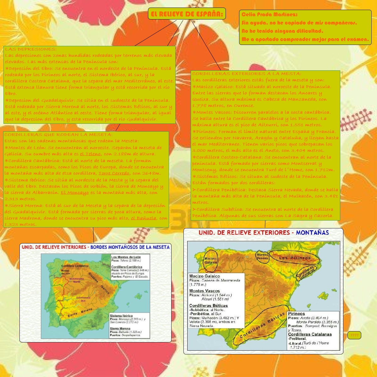 Este Cmap, tiene información relacionada con: cono tema 10 por celia 2 parte, EL RELIEVE DE ESPAÑA: ???? CORDILLERAS QUE RODEAN LA MESETA: Estas son las cadenas montañosas que rodean la Meseta: ∗Montes de León: Se encuentran al noroeste. Separan la meseta de Galicia. Su cumbre más alta es el Teleno, con 2.188m de altura. ∗Cordillera Cantábrica: Está al norte de la meseta. La forman montañas escarpadas, como los Picos de Europa, donde se encuentra la montaña más alta de etsa cordillera, Torre Cerredo, con 2648m. ∗Sistema Ibérico: Se sitúa al nordeste de la Mesta y la separa del valle del Ebro. Destacan los Picos de Urbión, la sierra de Moncayo y la sierra de Albarracín. El Moncayo es la montaña más alta, con 2.313 metros. ∗Sierra Morena: Está al sur de la Meseta y la separa de la depresión del Guadalquivir. Está formada por sierras de poca altura, como la sierra Madrona, donde se encuentra su pico más alto, el Bañuela, con 1.323 metros., CORDILLERAS QUE RODEAN LA MESETA: Estas son las cadenas montañosas que rodean la Meseta: ∗Montes de León: Se encuentran al noroeste. Separan la meseta de Galicia. Su cumbre más alta es el Teleno, con 2.188m de altura. ∗Cordillera Cantábrica: Está al norte de la meseta. La forman montañas escarpadas, como los Picos de Europa, donde se encuentra la montaña más alta de etsa cordillera, Torre Cerredo, con 2648m. ∗Sistema Ibérico: Se sitúa al nordeste de la Mesta y la separa del valle del Ebro. Destacan los Picos de Urbión, la sierra de Moncayo y la sierra de Albarracín. El Moncayo es la montaña más alta, con 2.313 metros. ∗Sierra Morena: Está al sur de la Meseta y la separa de la depresión del Guadalquivir. Está formada por sierras de poca altura, como la sierra Madrona, donde se encuentra su pico más alto, el Bañuela, con 1.323 metros. ????, CORDILLERAS EXTERIORES A LA MESTA: Las cordilleras exteriores estás fuera de la meseta y son: ∗Macizo Galaico: Está situado al noroeste de la Peninsula. Entre las sierras que lo forman destacan los Ancares y Queixa. Su altura máxima es Cabeza de Manzaneda, con 1.778 metros, en Ourense. ∗Montes Vascos: Discurren paralelos a la costa cantábrica. Se halla entre la Cordillera Cantábrica y los Pirineos. La máxima altura es el pico de Aitxurri, con 1.551 metros. ∗Pirineos: Forman el límite natural entre España y Francia. Se extienden por Navarra, Aragón y Cataluña, y llegan hasta el mar Mediterraneo. Tienen varios picos que sobrepasan los 3.000 metros, el más alto es el Aneto, con 3.404 metros. ∗Cordillera Costero-Catalana: Se encuentran al norte de la peninsula. Está formado por sierras como Montserrat y Montseny, donde se encuentra Turó de l´Home, con 1.712m. ∗Sistémas Béticos: Se situan al sudeste de la Península. Están formados por dos cordilleras: ≻Cordillera Penibética: Destaca Sierra Nevada, donde se halla la montaña más alta de la Península, el Mulhacén, con 3.481 metros. ≻Cordillera Subética: Se encuentra al norte de la Cordillera Penibética. Algunas de sus sierras son La Sagra y Cazorla. ????, CORDILLERAS EXTERIORES A LA MESTA: Las cordilleras exteriores estás fuera de la meseta y son: ∗Macizo Galaico: Está situado al noroeste de la Peninsula. Entre las sierras que lo forman destacan los Ancares y Queixa. Su altura máxima es Cabeza de Manzaneda, con 1.778 metros, en Ourense. ∗Montes Vascos: Discurren paralelos a la costa cantábrica. Se halla entre la Cordillera Cantábrica y los Pirineos. La máxima altura es el pico de Aitxurri, con 1.551 metros. ∗Pirineos: Forman el límite natural entre España y Francia. Se extienden por Navarra, Aragón y Cataluña, y llegan hasta el mar Mediterraneo. Tienen varios picos que sobrepasan los 3.000 metros, el más alto es el Aneto, con 3.404 metros. ∗Cordillera Costero-Catalana: Se encuentran al norte de la peninsula. Está formado por sierras como Montserrat y Montseny, donde se encuentra Turó de l´Home, con 1.712m. ∗Sistémas Béticos: Se situan al sudeste de la Península. Están formados por dos cordilleras: ≻Cordillera Penibética: Destaca Sierra Nevada, donde se halla la montaña más alta de la Península, el Mulhacén, con 3.481 metros. ≻Cordillera Subética: Se encuentra al norte de la Cordillera Penibética. Algunas de sus sierras son La Sagra y Cazorla. ???? EL RELIEVE DE ESPAÑA:, LAS DEPRESIONES: Las depresiones son zonas hundidas rodeadas por terrenos más elevada elevados. Las más extensas de la Península son: ∗Depresión del Ebro: Se encuentra en el nordeste de la Península. Está rodeada por los Pirineos al norte, el Sistema Ibérico, al sur, y la cordillera Costera Catalana, que la separa del mar Mediterráneo, al este. Está extensa llanura tiene forma triangular y está recorrida por el río Ebro. ∗Depresion del Guadalquivir: Se sitúa en el sudoeste de la Peninsula. Está rodeada por Sierra Morena al norte, los Sistemas Béticos, al sur y al este, y el océano Atlántico al oeste. Tiene forma triangular, al igual que la depresion del Ebro, y esta recorrida por el rio Gudalquivir. ???? EL RELIEVE DE ESPAÑA: