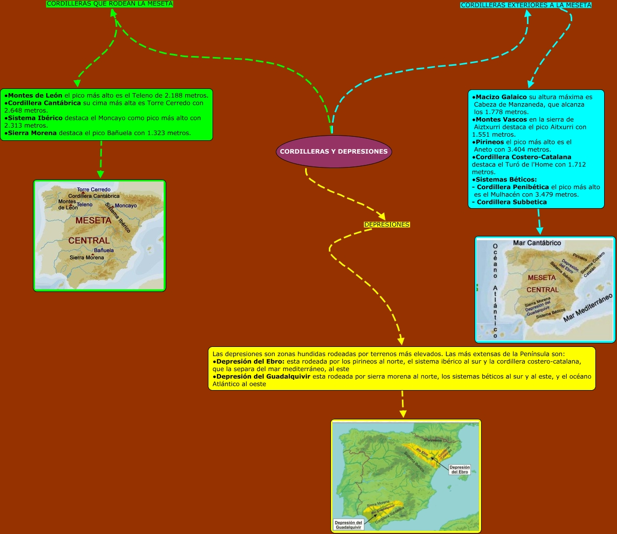 Este Cmap, tiene información relacionada con: tema 9 2ª parte valeria, CORDILLERAS Y DEPRESIONES DEPRESIONES Las depresiones son zonas hundidas rodeadas por terrenos más elevados. Las más extensas de la Península son: ∙Depresión del Ebro: esta rodeada por los pirineos al norte, el sistema ibérico al sur y la cordillera costero-catalana, que la separa del mar mediterráneo, al este ∙Depresión del Guadalquivir esta rodeada por sierra morena al norte, los sistemas béticos al sur y al este, y el océano Atlántico al oeste, CORDILLERAS Y DEPRESIONES CORDILLERAS EXTERIORES A LA MESETA ∙Macizo Galaico su altura máxima es Cabeza de Manzaneda, que alcanza los 1.778 metros. ∙Montes Vascos en la sierra de Aiztxurri destaca el pico Aitxurri con 1.551 metros. ∙Pirineos el pico más alto es el Aneto con 3.404 metros. ∙Cordillera Costero-Catalana destaca el Turó de l'Home con 1.712 metros. ∙Sistemas Béticos: - Cordillera Penibética el pico más alto es el Mulhacén con 3.479 metros. - Cordillera Subbetica, ∙Macizo Galaico su altura máxima es Cabeza de Manzaneda, que alcanza los 1.778 metros. ∙Montes Vascos en la sierra de Aiztxurri destaca el pico Aitxurri con 1.551 metros. ∙Pirineos el pico más alto es el Aneto con 3.404 metros. ∙Cordillera Costero-Catalana destaca el Turó de l'Home con 1.712 metros. ∙Sistemas Béticos: - Cordillera Penibética el pico más alto es el Mulhacén con 3.479 metros. - Cordillera Subbetica ????, CORDILLERAS Y DEPRESIONES CORDILLERAS QUE RODEAN LA MESETA ∙Montes de León el pico más alto es el Teleno de 2.188 metros. ∙Cordillera Cantábrica su cima más alta es Torre Cerredo con 2.648 metros. ∙Sistema Ibérico destaca el Moncayo como pico más alto con 2.313 metros. ∙Sierra Morena destaca el pico Bañuela con 1.323 metros., Las depresiones son zonas hundidas rodeadas por terrenos más elevados. Las más extensas de la Península son: ∙Depresión del Ebro: esta rodeada por los pirineos al norte, el sistema ibérico al sur y la cordillera costero-catalana, que la separa del mar mediterráneo, al este ∙Depresión del Guadalquivir esta rodeada por sierra morena al norte, los sistemas béticos al sur y al este, y el océano Atlántico al oeste ????, ∙Montes de León el pico más alto es el Teleno de 2.188 metros. ∙Cordillera Cantábrica su cima más alta es Torre Cerredo con 2.648 metros. ∙Sistema Ibérico destaca el Moncayo como pico más alto con 2.313 metros. ∙Sierra Morena destaca el pico Bañuela con 1.323 metros. ????