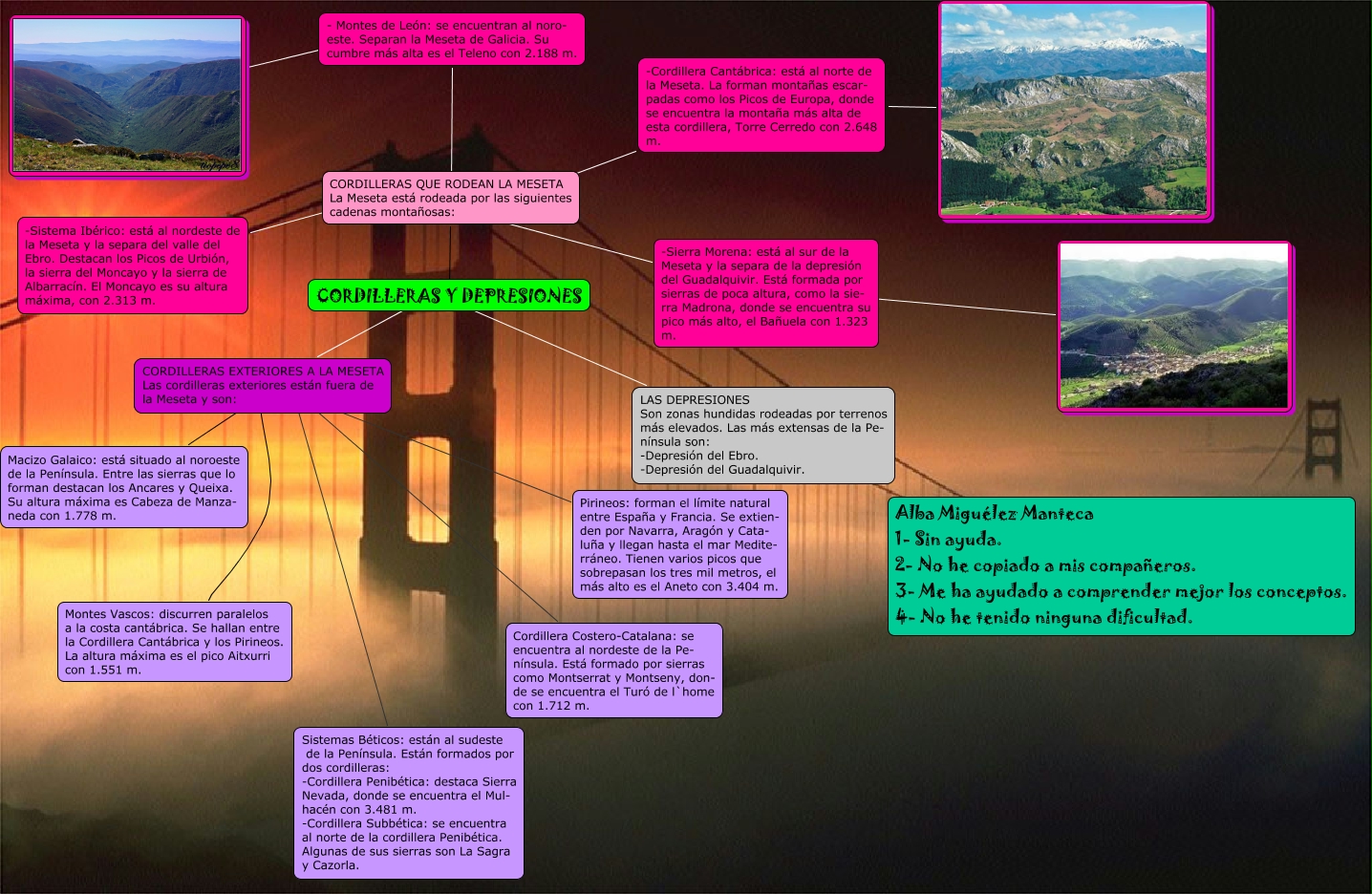 Este Cmap, tiene información relacionada con: cordilleras y depresiones alba, CORDILLERAS EXTERIORES A LA MESETA Las cordilleras exteriores están fuera de la Meseta y son: ???? Sistemas Béticos: están al sudeste de la Península. Están formados por dos cordilleras: -Cordillera Penibética: destaca Sierra Nevada, donde se encuentra el Mul- hacén con 3.481 m. -Cordillera Subbética: se encuentra al norte de la cordillera Penibética. Algunas de sus sierras son La Sagra y Cazorla., CORDILLERAS EXTERIORES A LA MESETA Las cordilleras exteriores están fuera de la Meseta y son: ???? Cordillera Costero-Catalana: se encuentra al nordeste de la Pe- nínsula. Está formado por sierras como Montserrat y Montseny, don- de se encuentra el Turó de l`home con 1.712 m., CORDILLERAS QUE RODEAN LA MESETA La Meseta está rodeada por las siguientes cadenas montañosas: ???? - Montes de León: se encuentran al noro- este. Separan la Meseta de Galicia. Su cumbre más alta es el Teleno con 2.188 m., CORDILLERAS EXTERIORES A LA MESETA Las cordilleras exteriores están fuera de la Meseta y son: ???? Montes Vascos: discurren paralelos a la costa cantábrica. Se hallan entre la Cordillera Cantábrica y los Pirineos. La altura máxima es el pico Aitxurri con 1.551 m., CORDILLERAS QUE RODEAN LA MESETA La Meseta está rodeada por las siguientes cadenas montañosas: ???? -Cordillera Cantábrica: está al norte de la Meseta. La forman montañas escar- padas como los Picos de Europa, donde se encuentra la montaña más alta de esta cordillera, Torre Cerredo con 2.648 m., CORDILLERAS Y DEPRESIONES ???? LAS DEPRESIONES Son zonas hundidas rodeadas por terrenos más elevados. Las más extensas de la Pe- nínsula son: -Depresión del Ebro. -Depresión del Guadalquivir., CORDILLERAS QUE RODEAN LA MESETA La Meseta está rodeada por las siguientes cadenas montañosas: ???? -Sierra Morena: está al sur de la Meseta y la separa de la depresión del Guadalquivir. Está formada por sierras de poca altura, como la sie- rra Madrona, donde se encuentra su pico más alto, el Bañuela con 1.323 m., CORDILLERAS EXTERIORES A LA MESETA Las cordilleras exteriores están fuera de la Meseta y son: ???? Pirineos: forman el límite natural entre España y Francia. Se extien- den por Navarra, Aragón y Cata- luña y llegan hasta el mar Medite- rráneo. Tienen varios picos que sobrepasan los tres mil metros, el más alto es el Aneto con 3.404 m., -Cordillera Cantábrica: está al norte de la Meseta. La forman montañas escar- padas como los Picos de Europa, donde se encuentra la montaña más alta de esta cordillera, Torre Cerredo con 2.648 m. ????, -Sierra Morena: está al sur de la Meseta y la separa de la depresión del Guadalquivir. Está formada por sierras de poca altura, como la sie- rra Madrona, donde se encuentra su pico más alto, el Bañuela con 1.323 m. ????, CORDILLERAS Y DEPRESIONES ???? CORDILLERAS EXTERIORES A LA MESETA Las cordilleras exteriores están fuera de la Meseta y son:, CORDILLERAS EXTERIORES A LA MESETA Las cordilleras exteriores están fuera de la Meseta y son: ???? Macizo Galaico: está situado al noroeste de la Península. Entre las sierras que lo forman destacan los Ancares y Queixa. Su altura máxima es Cabeza de Manza- neda con 1.778 m., CORDILLERAS QUE RODEAN LA MESETA La Meseta está rodeada por las siguientes cadenas montañosas: ???? -Sistema Ibérico: está al nordeste de la Meseta y la separa del valle del Ebro. Destacan los Picos de Urbión, la sierra del Moncayo y la sierra de Albarracín. El Moncayo es su altura máxima, con 2.313 m., CORDILLERAS Y DEPRESIONES ???? CORDILLERAS QUE RODEAN LA MESETA La Meseta está rodeada por las siguientes cadenas montañosas:, - Montes de León: se encuentran al noro- este. Separan la Meseta de Galicia. Su cumbre más alta es el Teleno con 2.188 m. ????