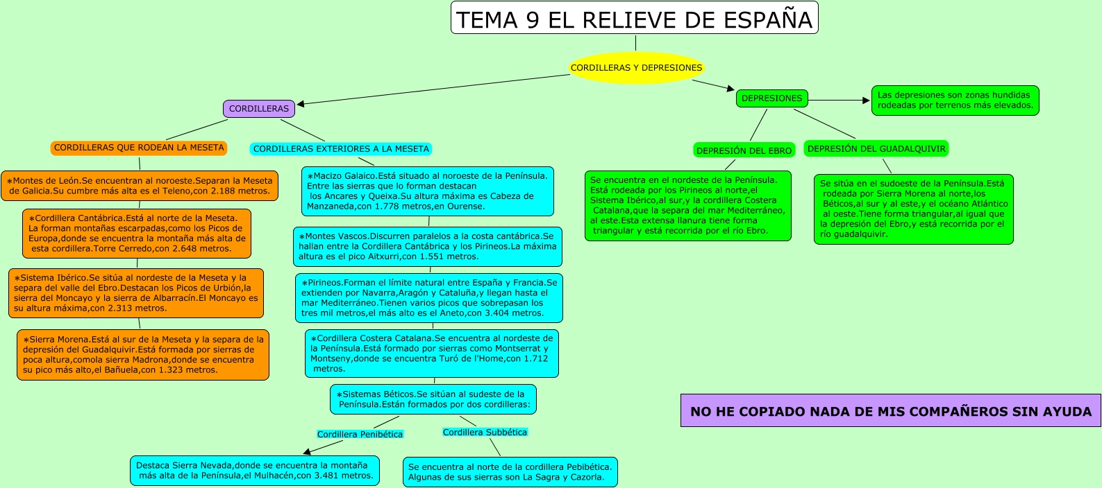 Este Cmap, tiene información relacionada con: CONO, ∗Sistemas Béticos.Se sitúan al sudeste de la Península.Están formados por dos cordilleras: Cordillera Penibética Destaca Sierra Nevada,donde se encuentra la montaña más alta de la Península,el Mulhacén,con 3.481 metros., ∗Sistema Ibérico.Se sitúa al nordeste de la Meseta y la separa del valle del Ebro.Destacan los Picos de Urbión,la sierra del Moncayo y la sierra de Albarracín.El Moncayo es su altura máxima,con 2.313 metros. ???? ∗Sierra Morena.Está al sur de la Meseta y la separa de la depresión del Guadalquivir.Está formada por sierras de poca altura,comola sierra Madrona,donde se encuentra su pico más alto,el Bañuela,con 1.323 metros., ∗Cordillera Cantábrica.Está al norte de la Meseta. La forman montañas escarpadas,como los Picos de Europa,donde se encuentra la montaña más alta de esta cordillera.Torre Cerredo,con 2.648 metros. ???? ∗Sistema Ibérico.Se sitúa al nordeste de la Meseta y la separa del valle del Ebro.Destacan los Picos de Urbión,la sierra del Moncayo y la sierra de Albarracín.El Moncayo es su altura máxima,con 2.313 metros., ∗Pirineos.Forman el límite natural entre España y Francia.Se extienden por Navarra,Aragón y Cataluña,y llegan hasta el mar Mediterráneo.Tienen varios picos que sobrepasan los tres mil metros,el más alto es el Aneto,con 3.404 metros. ???? ∗Cordillera Costera Catalana.Se encuentra al nordeste de la Península.Está formado por sierras como Montserrat y Montseny,donde se encuentra Turó de l'Home,con 1.712 metros., TEMA 9 EL RELIEVE DE ESPAÑA CORDILLERAS Y DEPRESIONES CORDILLERAS, CORDILLERAS CORDILLERAS EXTERIORES A LA MESETA ∗Macizo Galaico.Está situado al noroeste de la Península. Entre las sierras que lo forman destacan los Ancares y Queixa.Su altura máxima es Cabeza de Manzaneda,con 1.778 metros,en Ourense., DEPRESIONES DEPRESIÓN DEL GUADALQUIVIR Se sitúa en el sudoeste de la Península.Está rodeada por Sierra Morena al norte,los Béticos,al sur y al este,y el océano Atlántico al oeste.Tiene forma triangular,al igual que la depresión del Ebro,y está recorrida por el río guadalquivir., ∗Cordillera Costera Catalana.Se encuentra al nordeste de la Península.Está formado por sierras como Montserrat y Montseny,donde se encuentra Turó de l'Home,con 1.712 metros. ???? ∗Sistemas Béticos.Se sitúan al sudeste de la Península.Están formados por dos cordilleras:, ∗Montes Vascos.Discurren paralelos a la costa cantábrica.Se hallan entre la Cordillera Cantábrica y los Pirineos.La máxima altura es el pico Aitxurri,con 1.551 metros. ???? ∗Pirineos.Forman el límite natural entre España y Francia.Se extienden por Navarra,Aragón y Cataluña,y llegan hasta el mar Mediterráneo.Tienen varios picos que sobrepasan los tres mil metros,el más alto es el Aneto,con 3.404 metros., CORDILLERAS CORDILLERAS QUE RODEAN LA MESETA ∗Montes de León.Se encuentran al noroeste.Separan la Meseta de Galicia.Su cumbre más alta es el Teleno,con 2.188 metros., ∗Montes de León.Se encuentran al noroeste.Separan la Meseta de Galicia.Su cumbre más alta es el Teleno,con 2.188 metros. ???? ∗Cordillera Cantábrica.Está al norte de la Meseta. La forman montañas escarpadas,como los Picos de Europa,donde se encuentra la montaña más alta de esta cordillera.Torre Cerredo,con 2.648 metros., DEPRESIONES DEPRESIÓN DEL EBRO Se encuentra en el nordeste de la Península. Está rodeada por los Pirineos al norte,el Sistema Ibérico,al sur,y la cordillera Costera Catalana,que la separa del mar Mediterráneo, al este.Esta extensa llanura tiene forma triangular y está recorrida por el río Ebro., ∗Macizo Galaico.Está situado al noroeste de la Península. Entre las sierras que lo forman destacan los Ancares y Queixa.Su altura máxima es Cabeza de Manzaneda,con 1.778 metros,en Ourense. ???? ∗Montes Vascos.Discurren paralelos a la costa cantábrica.Se hallan entre la Cordillera Cantábrica y los Pirineos.La máxima altura es el pico Aitxurri,con 1.551 metros., DEPRESIONES ???? Las depresiones son zonas hundidas rodeadas por terrenos más elevados., ∗Sistemas Béticos.Se sitúan al sudeste de la Península.Están formados por dos cordilleras: Cordillera Subbética Se encuentra al norte de la cordillera Pebibética. Algunas de sus sierras son La Sagra y Cazorla., TEMA 9 EL RELIEVE DE ESPAÑA CORDILLERAS Y DEPRESIONES DEPRESIONES