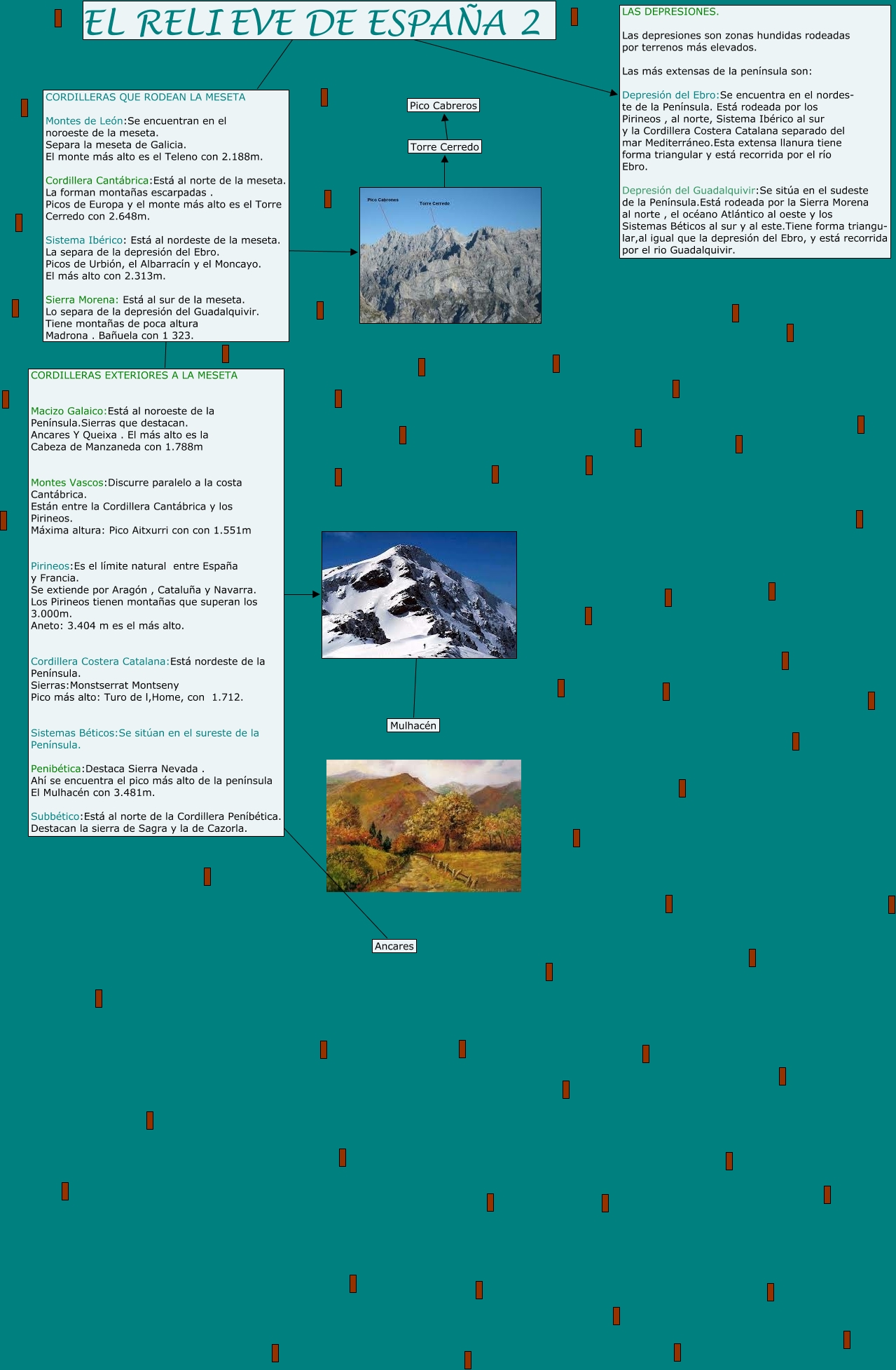 Este Cmap, tiene información relacionada con: cono 2 9 furones chaguaceda Jorge, EL RELIEVE DE ESPAÑA 2 ???? CORDILLERAS QUE RODEAN LA MESETA Montes de León:Se encuentran en el noroeste de la meseta. Separa la meseta de Galicia. El monte más alto es el Teleno con 2.188m. Cordillera Cantábrica:Está al norte de la meseta. La forman montañas escarpadas . Picos de Europa y el monte más alto es el Torre Cerredo con 2.648m. Sistema Ibérico: Está al nordeste de la meseta. La separa de la depresión del Ebro. Picos de Urbión, el Albarracín y el Moncayo. El más alto con 2.313m. Sierra Morena: Está al sur de la meseta. Lo separa de la depresión del Guadalquivir. Tiene montañas de poca altura Madrona . Bañuela con 1 323., CORDILLERAS QUE RODEAN LA MESETA Montes de León:Se encuentran en el noroeste de la meseta. Separa la meseta de Galicia. El monte más alto es el Teleno con 2.188m. Cordillera Cantábrica:Está al norte de la meseta. La forman montañas escarpadas . Picos de Europa y el monte más alto es el Torre Cerredo con 2.648m. Sistema Ibérico: Está al nordeste de la meseta. La separa de la depresión del Ebro. Picos de Urbión, el Albarracín y el Moncayo. El más alto con 2.313m. Sierra Morena: Está al sur de la meseta. Lo separa de la depresión del Guadalquivir. Tiene montañas de poca altura Madrona . Bañuela con 1 323. ???? CORDILLERAS EXTERIORES A LA MESETA Macizo Galaico:Está al noroeste de la Península.Sierras que destacan. Ancares Y Queixa . El más alto es la Cabeza de Manzaneda con 1.788m Montes Vascos:Discurre paralelo a la costa Cantábrica. Están entre la Cordillera Cantábrica y los Pirineos. Máxima altura: Pico Aitxurri con con 1.551m Pirineos:Es el límite natural entre España y Francia. Se extiende por Aragón , Cataluña y Navarra. Los Pirineos tienen montañas que superan los 3.000m. Aneto: 3.404 m es el más alto. Cordillera Costera Catalana:Está nordeste de la Península. Sierras:Monstserrat Montseny Pico más alto: Turo de l,Home, con 1.712. Sistemas Béticos:Se sitúan en el sureste de la Península. Penibética:Destaca Sierra Nevada . Ahí se encuentra el pico más alto de la península El Mulhacén con 3.481m. Subbético:Está al norte de la Cordillera Peníbética. Destacan la sierra de Sagra y la de Cazorla., CORDILLERAS EXTERIORES A LA MESETA Macizo Galaico:Está al noroeste de la Península.Sierras que destacan. Ancares Y Queixa . El más alto es la Cabeza de Manzaneda con 1.788m Montes Vascos:Discurre paralelo a la costa Cantábrica. Están entre la Cordillera Cantábrica y los Pirineos. Máxima altura: Pico Aitxurri con con 1.551m Pirineos:Es el límite natural entre España y Francia. Se extiende por Aragón , Cataluña y Navarra. Los Pirineos tienen montañas que superan los 3.000m. Aneto: 3.404 m es el más alto. Cordillera Costera Catalana:Está nordeste de la Península. Sierras:Monstserrat Montseny Pico más alto: Turo de l,Home, con 1.712. Sistemas Béticos:Se sitúan en el sureste de la Península. Penibética:Destaca Sierra Nevada . Ahí se encuentra el pico más alto de la península El Mulhacén con 3.481m. Subbético:Está al norte de la Cordillera Peníbética. Destacan la sierra de Sagra y la de Cazorla. ????, ???? Mulhacén, CORDILLERAS EXTERIORES A LA MESETA Macizo Galaico:Está al noroeste de la Península.Sierras que destacan. Ancares Y Queixa . El más alto es la Cabeza de Manzaneda con 1.788m Montes Vascos:Discurre paralelo a la costa Cantábrica. Están entre la Cordillera Cantábrica y los Pirineos. Máxima altura: Pico Aitxurri con con 1.551m Pirineos:Es el límite natural entre España y Francia. Se extiende por Aragón , Cataluña y Navarra. Los Pirineos tienen montañas que superan los 3.000m. Aneto: 3.404 m es el más alto. Cordillera Costera Catalana:Está nordeste de la Península. Sierras:Monstserrat Montseny Pico más alto: Turo de l,Home, con 1.712. Sistemas Béticos:Se sitúan en el sureste de la Península. Penibética:Destaca Sierra Nevada . Ahí se encuentra el pico más alto de la península El Mulhacén con 3.481m. Subbético:Está al norte de la Cordillera Peníbética. Destacan la sierra de Sagra y la de Cazorla. ???? Ancares, EL RELIEVE DE ESPAÑA 2 ???? LAS DEPRESIONES. Las depresiones son zonas hundidas rodeadas por terrenos más elevados. Las más extensas de la península son: Depresión del Ebro:Se encuentra en el nordes- te de la Península. Está rodeada por los Pirineos , al norte, Sistema Ibérico al sur y la Cordillera Costera Catalana separado del mar Mediterráneo.Esta extensa llanura tiene forma triangular y está recorrida por el río Ebro. Depresión del Guadalquivir:Se sitúa en el sudeste de la Península.Está rodeada por la Sierra Morena al norte , el océano Atlántico al oeste y los Sistemas Béticos al sur y al este.Tiene forma triangu- lar,al igual que la depresión del Ebro, y está recorrida por el rio Guadalquivir., CORDILLERAS QUE RODEAN LA MESETA Montes de León:Se encuentran en el noroeste de la meseta. Separa la meseta de Galicia. El monte más alto es el Teleno con 2.188m. Cordillera Cantábrica:Está al norte de la meseta. La forman montañas escarpadas . Picos de Europa y el monte más alto es el Torre Cerredo con 2.648m. Sistema Ibérico: Está al nordeste de la meseta. La separa de la depresión del Ebro. Picos de Urbión, el Albarracín y el Moncayo. El más alto con 2.313m. Sierra Morena: Está al sur de la meseta. Lo separa de la depresión del Guadalquivir. Tiene montañas de poca altura Madrona . Bañuela con 1 323. ????, Torre Cerredo ???? Pico Cabreros, ???? Torre Cerredo