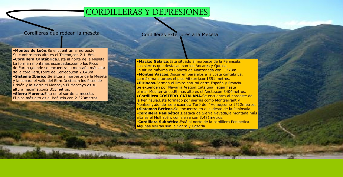 Este Cmap, tiene información relacionada con: andres tema 9 cono cordilleras, CORDILLERAS Y DEPRESIONES Cordilleras exteriores a la Meseta ∙Macizo Galaico.Esta situado al noroeste de la Península. Las sierras que destacan son los Ancares y Quexia. La altura máxima es Cabeza de Manzaneda con 1778m. ∙Montes Vascos.Discurren paralelos a la costa cantábrica. La máxima alturaes el pico Aitxurri,con1551 metros. ∙Pirineos.Forman el límite natural entre España y Francia. Se extienden por Navarra,Aragón,Cataluña,llegan hasta el mar Mediterráneo.El más alto es el Aneto,con 3404metros. ∙Cordillera COSTERO-CATALANA.Se encuentra al noroeste de la Península.Está formado por sierras como Montserrant y Montseny,donde se encuentra Turó de l´Home,como 1712metros. ∙Sistemas Béticos.Se encuentra en el sudeste de la Península. -Cordillera Penibética.Destaca de Sierra Nevada,la montaña más alta es el Mulhacén, con sierra con 3.481metros. -Cordillera Subbética.Está al norte de la cordillera Penibética. Algunas sierras son la Sagra y Cazorla., CORDILLERAS Y DEPRESIONES Cordilleras que rodean la meseta ∙Montes de León.Se encuentran al noroeste. Su cumbre más alta es el Teleno,con 2.118m. ∙Cordillera Cantábrica.Está al norte de la Meseta. La forman montañas escarpadas,como los Picos de Europa,donde se encuentra la montaña más alta de la cordillera,Torre de Cerredo,con 2.648m ∙Sistema Ibérico.Se sitúa al noroeste de la Meseta y la separa el valle del Ebro.Destacan los Picos de Urbión y la sierra el Moncayo.El Moncayo es su altura máxima,con2.313metros. ∙Sierra Morena.Está en el sur de la meseta. El pico más alto es el Bañuela con 2.323metros.