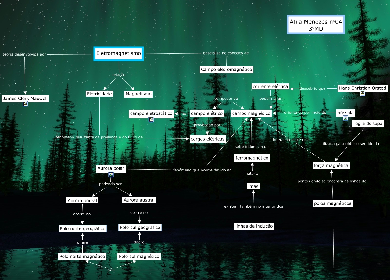Esse mapa conceitual, produzido no IHMC CmapTools, tem a informação relacionada a: 04-Átila, Aurora polar podendo ser Aurora boreal, polos magnéticos pontos onde se encontra as linhas de força magnética, regra do tapa utilizada para obter o sentido da força magnética, polos magnéticos são Polo sul magnético, Aurora austral ocorre no Polo sul geográfico, força magnética interação entre dois campo magnético, linhas de indução existem também no interior dos imãs, polos magnéticos são Polo norte magnético, Eletricidade fenômeno resultante da presença e do fluxo de cargas elétricas, Polo norte magnético difere Polo norte geográfico, campo elétrico provocado por cargas elétricas, Aurora boreal ocorre no Polo norte geográfico, Eletromagnetismo relação Magnetismo, campo elétrico ou campo eletrostático, bússola orienta-se por meio do campo magnético, Aurora polar podendo ser Aurora austral, Hans Christian Orsted descobriu que corrente elétrica, imãs material ferromagnético, Campo eletromagnético composto de campo magnético, ferromagnético sofre influência do campo magnético