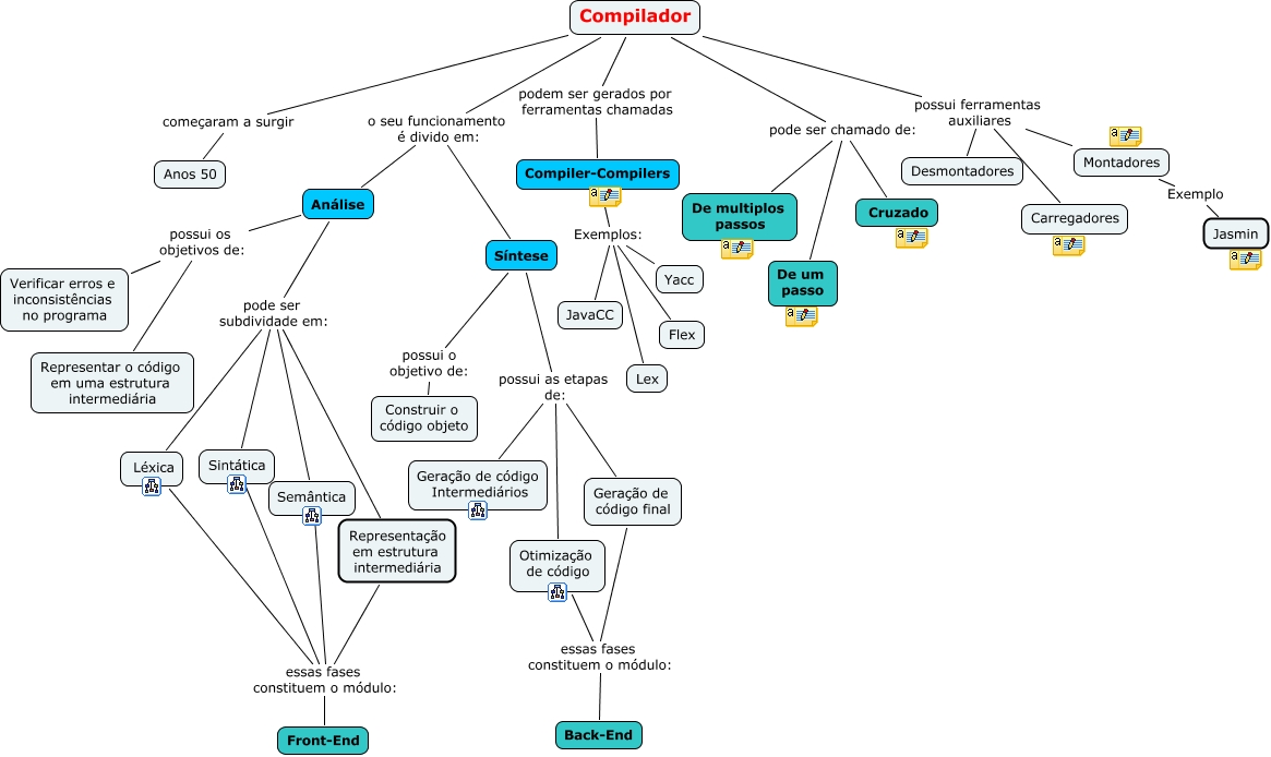 Esse mapa conceitual, produzido no IHMC CmapTools, tem a informação relacionada a: Mapa Conceitual Compilador, Geração de código final essas fases constituem o módulo: Back-End, Compilador podem ser gerados por ferramentas chamadas Compiler-Compilers, Análise pode ser subdividade em: Representação em estrutura intermediária, Compiler-Compilers Exemplos: Yacc, Compiler-Compilers Exemplos: Flex, Otimização de código essas fases constituem o módulo: Back-End, Síntese possui as etapas de: Geração de código final, Sintática essas fases constituem o módulo: Front-End, Compilador começaram a surgir Anos 50, Análise possui os objetivos de: Representar o código em uma estrutura intermediária, Síntese possui as etapas de: Geração de código Intermediários, Compiler-Compilers Exemplos: JavaCC, Representação em estrutura intermediária essas fases constituem o módulo: Front-End, Compilador possui ferramentas auxiliares Montadores, Compilador possui ferramentas auxiliares Desmontadores, Síntese possui as etapas de: Otimização de código, Análise pode ser subdividade em: Semântica, Compilador possui ferramentas auxiliares Carregadores, Síntese possui o objetivo de: Construir o código objeto, Compilador o seu funcionamento é divido em: Síntese