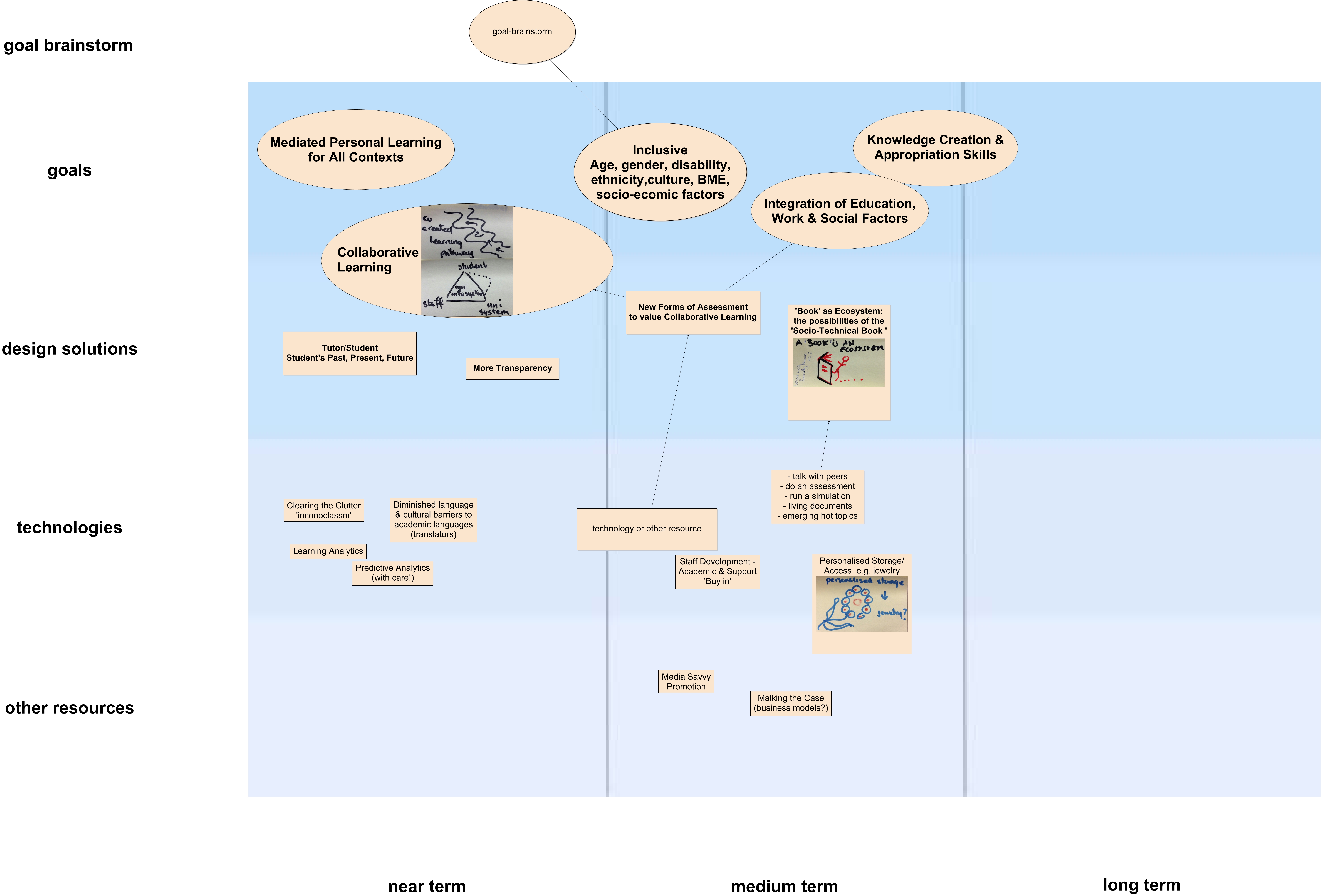 This Concept Map, created with IHMC CmapTools, has information related to: Group1, goal-brainstorm Inclusive Age, gender, disability, ethnicity,culture, BME, socio-ecomic factors, technology or other resource New Forms of Assessment to value Collaborative Learning, New Forms of Assessment to value Collaborative Learning Collaborative Learning, - talk with peers - do an assessment - run a simulation - living documents - emerging hot topics ???? 'Book' as Ecosystem: the possibilities of the 'Socio-Technical Book ', New Forms of Assessment to value Collaborative Learning Integration of Education, Work & Social Factors