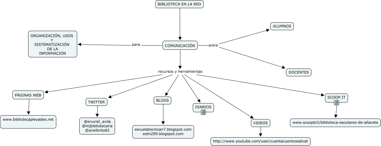 Este Cmap, tiene información relacionada con: biblioteca en la red, SCOOP.IT ???? www.scoopit/t/biblioteca-escolares-de-allacete, COMUNICACIÓN para ORGANIZACIÓN, USOS Y SISTEMATIZACIÓN DE LA INFORMACIÓN, VIDEOS ???? http://www.youtube.com/user/cuentacuentossalvat, COMUNICACIÓN entre ALUMNOS, COMUNICACIÓN recursos y herramientas DIARIOS, COMUNICACIÓN recursos y herramientas PÁGINAS WEB, TWITTER ???? @eruviel_avila @mjbibliotecaria @arielbrito82, COMUNICACIÓN recursos y herramientas SCOOP.IT, BIBLIOTECA EN LA RED ???? COMUNICACIÓN, PÁGINAS WEB ???? www.bibliotecapleyades.net, COMUNICACIÓN recursos y herramientas TWITTER, COMUNICACIÓN recursos y herramientas VIDEOS, COMUNICACIÓN recursos y herramientas BLOGS, COMUNICACIÓN entre DOCENTES, BLOGS ???? escuelatecnican7.blogspot.com eetn299.blogspot.com