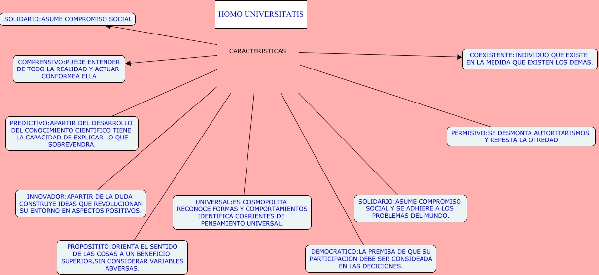 Este Cmap, tiene información relacionada con: HOMO UNIVERSITATIS, HOMO UNIVERSITATIS CARACTERISTICAS COMPRENSIVO:PUEDE ENTENDER DE TODO LA REALIDAD Y ACTUAR CONFORMEA ELLA, HOMO UNIVERSITATIS CARACTERISTICAS COEXISTENTE:INDIVIDUO QUE EXISTE EN LA MEDIDA QUE EXISTEN LOS DEMAS., HOMO UNIVERSITATIS CARACTERISTICAS PREDICTIVO:APARTIR DEL DESARROLLO DEL CONOCIMIENTO CIENTIFICO TIENE LA CAPACIDAD DE EXPLICAR LO QUE SOBREVENDRA., HOMO UNIVERSITATIS CARACTERISTICAS SOLIDARIO:ASUME COMPROMISO SOCIAL Y SE ADHIERE A LOS PROBLEMAS DEL MUNDO., HOMO UNIVERSITATIS CARACTERISTICAS SOLIDARIO:ASUME COMPROMISO SOCIAL, HOMO UNIVERSITATIS CARACTERISTICAS PROPOSITITO:ORIENTA EL SENTIDO DE LAS COSAS A UN BENEFICIO SUPERIOR,SIN CONSIDERAR VARIABLES ABVERSAS., HOMO UNIVERSITATIS CARACTERISTICAS INNOVADOR:APARTIR DE LA DUDA CONSTRUYE IDEAS QUE REVOLUCIONAN SU ENTORNO EN ASPECTOS POSITIVOS., HOMO UNIVERSITATIS CARACTERISTICAS UNIVERSAL:ES COSMOPOLITA RECONOCE FORMAS Y COMPORTAMIENTOS IDENTIFICA CORRIENTES DE PENSAMIENTO UNIVERSAL., HOMO UNIVERSITATIS CARACTERISTICAS PERMISIVO:SE DESMONTA AUTORITARISMOS Y REPESTA LA OTREDAD, HOMO UNIVERSITATIS CARACTERISTICAS DEMOCRATICO:LA PREMISA DE QUE SU PARTICIPACION DEBE SER CONSIDEADA EN LAS DECICIONES.