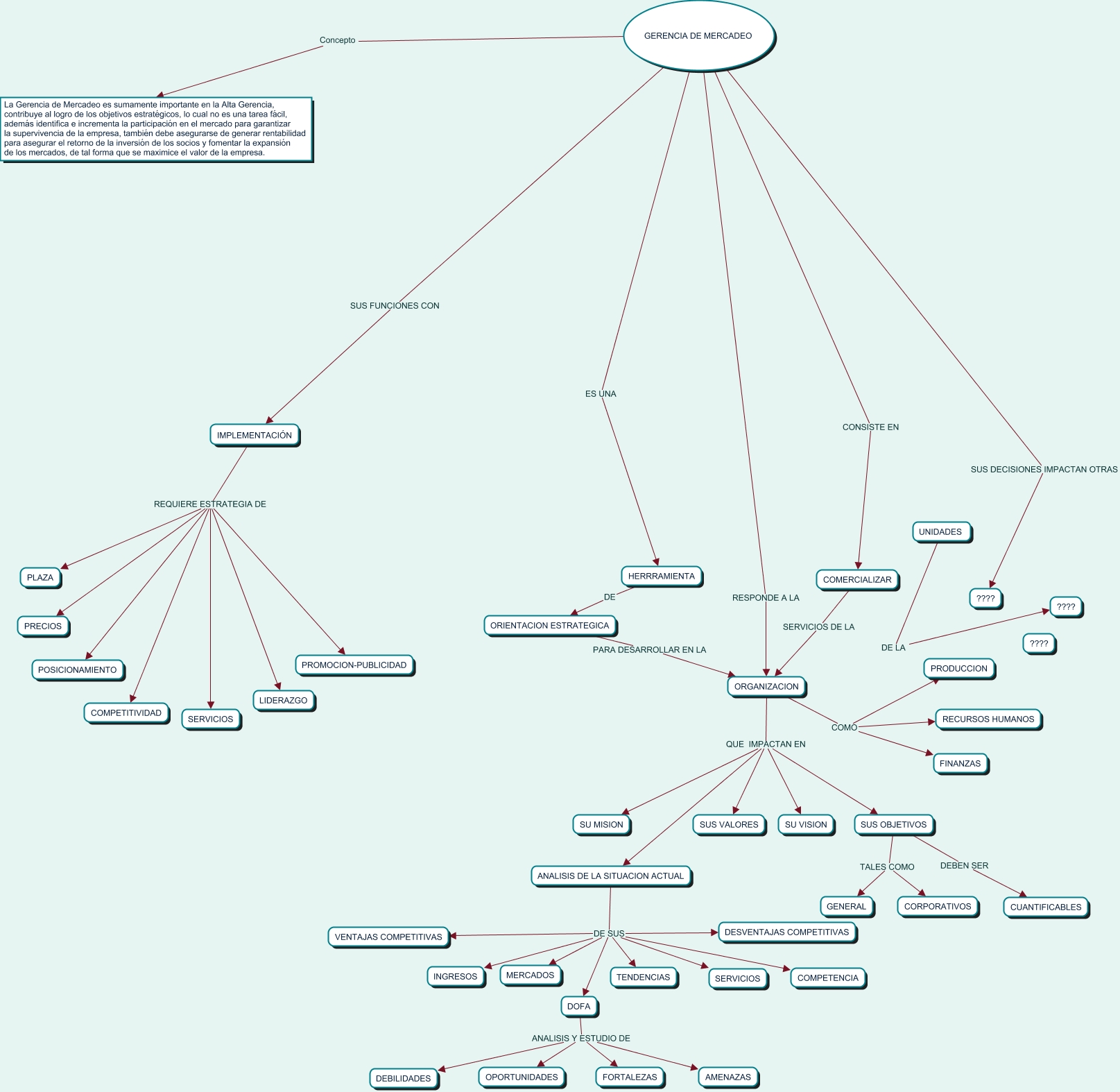 Este Cmap, tiene información relacionada con: Sin Título 1, IMPLEMENTACIÓN REQUIERE ESTRATEGIA DE LIDERAZGO, HERRRAMIENTA DE ORIENTACION ESTRATEGICA, ANALISIS DE LA SITUACION ACTUAL DE SUS TENDENCIAS, COMERCIALIZAR SERVICIOS DE LA ORGANIZACION, IMPLEMENTACIÓN REQUIERE ESTRATEGIA DE SERVICIOS, ORGANIZACION COMO FINANZAS, SUS OBJETIVOS TALES COMO CORPORATIVOS, IMPLEMENTACIÓN REQUIERE ESTRATEGIA DE PRECIOS, IMPLEMENTACIÓN REQUIERE ESTRATEGIA DE PLAZA, ANALISIS DE LA SITUACION ACTUAL DE SUS INGRESOS, SUS OBJETIVOS TALES COMO GENERAL, ORGANIZACION QUE IMPACTAN EN ANALISIS DE LA SITUACION ACTUAL, ANALISIS DE LA SITUACION ACTUAL DE SUS DOFA, ORGANIZACION COMO PRODUCCION, ANALISIS DE LA SITUACION ACTUAL DE SUS VENTAJAS COMPETITIVAS, ORIENTACION ESTRATEGICA PARA DESARROLLAR EN LA ORGANIZACION, GERENCIA DE MERCADEO Concepto La Gerencia de Mercadeo es sumamente importante en la Alta Gerencia, contribuye al logro de los objetivos estratégicos, lo cual no es una tarea fácil, además identifica e incrementa la participación en el mercado para garantizar la supervivencia de la empresa, también debe asegurarse de generar rentabilidad para asegurar el retorno de la inversión de los socios y fomentar la expansión de los mercados, de tal forma que se maximice el valor de la empresa., IMPLEMENTACIÓN REQUIERE ESTRATEGIA DE POSICIONAMIENTO, ORGANIZACION QUE IMPACTAN EN SUS OBJETIVOS, DOFA ANALISIS Y ESTUDIO DE AMENAZAS