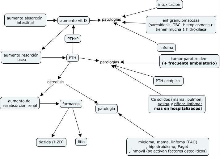 Este Cmap, tiene información relacionada con: Etiologías de hipercalcemia, PTH osteolisis patología, PTH PTHrP, farmacos litio, farmacos tiazida (HZD), PTH osteolisis aumento de resabsorción renal, aumento resorción osea PTH, aumento absorción intestinal aumento vit D, mieloma, mama, linfoma (FAO) , hipotiroidismo, Paget , inmovil (se activan factores osteoliticos) patología, aumento vit D aumento resorción osea, aumento de resabsorción renal farmacos, PTHrP aumento vit D