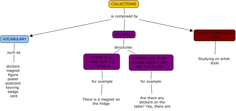 Este Cmap, tiene información relacionada con: COLLECTIONS(Lucía Ro), +THERE IS A... -THERE ISN T A... *IS THERE A...? for example There is a magnet on the fridge, GRAMMAR structures +THERE ARE SOME... -THERE AREN T ANY... *ARE THERE ANY...?, VOCABULARY such as stickers magnet figure poster postcard keyring badge card, CROSS-CURRICULAR TOPIC ???? Studying on artist style, COLLECTIONS is composed by GRAMMAR, GRAMMAR structures +THERE IS A... -THERE ISN T A... *IS THERE A...?, COLLECTIONS is composed by CROSS-CURRICULAR TOPIC, COLLECTIONS is composed by VOCABULARY, +THERE ARE SOME... -THERE AREN T ANY... *ARE THERE ANY...? for example Are there any stickers on the table? Yes, there are
