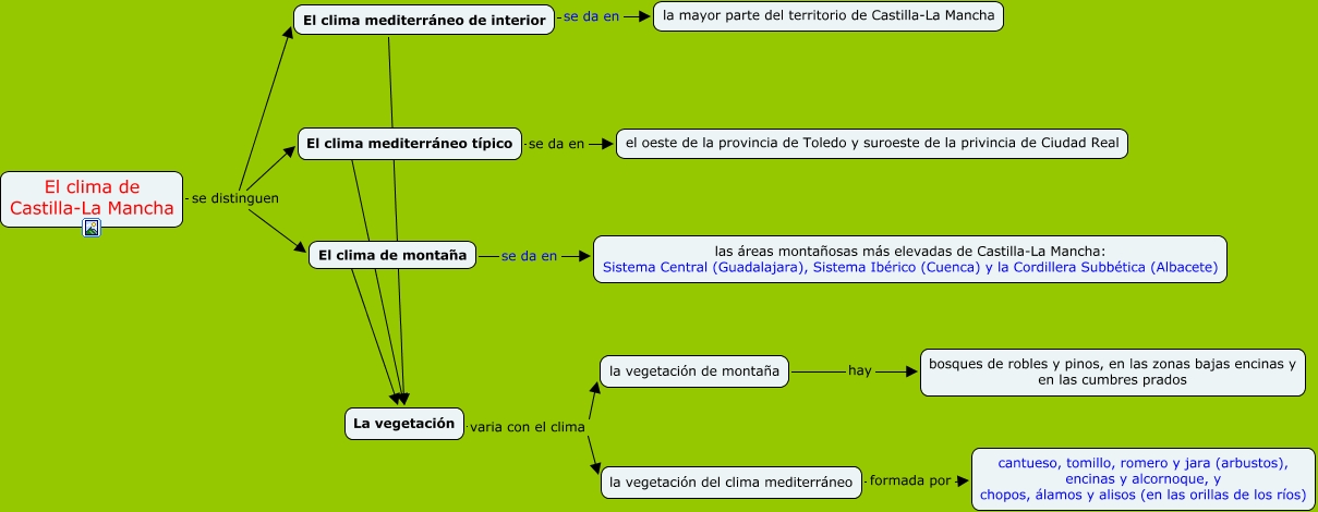 Este Cmap, tiene información relacionada con: El clima de Castilla-La Mancha, El clima mediterráneo de interior ???? La vegetación, La vegetación varia con el clima la vegetación del clima mediterráneo, El clima mediterráneo típico ???? La vegetación, El clima de Castilla-La Mancha se distinguen El clima de montaña, El clima mediterráneo típico se da en el oeste de la provincia de Toledo y suroeste de la privincia de Ciudad Real, La vegetación varia con el clima la vegetación de montaña, El clima mediterráneo de interior se da en la mayor parte del territorio de Castilla-La Mancha, El clima de Castilla-La Mancha se distinguen El clima mediterráneo típico, la vegetación del clima mediterráneo formada por cantueso, tomillo, romero y jara (arbustos), encinas y alcornoque, y chopos, álamos y alisos (en las orillas de los ríos), la vegetación de montaña hay bosques de robles y pinos, en las zonas bajas encinas y en las cumbres prados, El clima de montaña se da en las áreas montañosas más elevadas de Castilla-La Mancha: Sistema Central (Guadalajara), Sistema Ibérico (Cuenca) y la Cordillera Subbética (Albacete), El clima de Castilla-La Mancha se distinguen El clima mediterráneo de interior, El clima de montaña ???? La vegetación