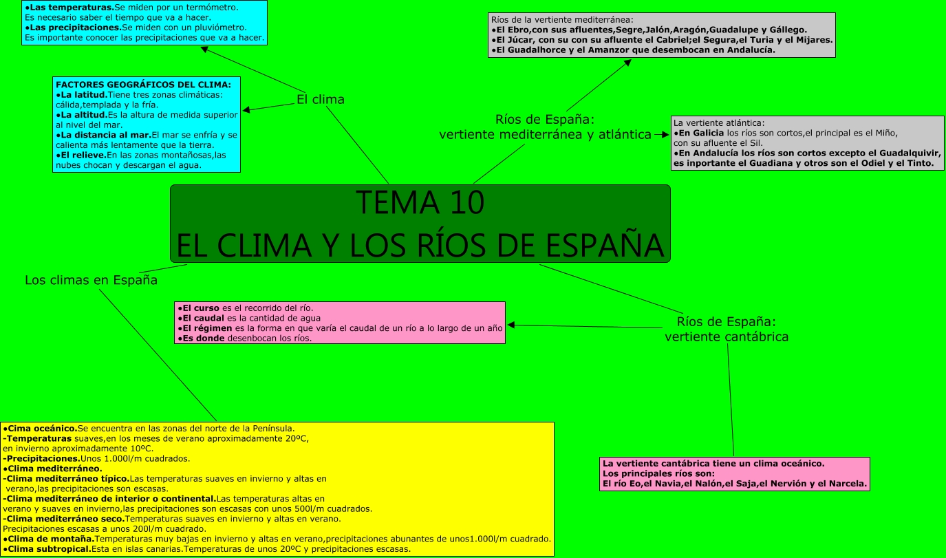 Este Cmap, tiene información relacionada con: tema 10 cono andrés, TEMA 10 EL CLIMA Y LOS RÍOS DE ESPAÑA Ríos de España: vertiente mediterránea y atlántica Ríos de la vertiente mediterránea: ∙El Ebro,con sus afluentes,Segre,Jalón,Aragón,Guadalupe y Gállego. ∙El Júcar, con su con su afluente el Cabriel;el Segura,el Turia y el Mijares. ∙El Guadalhorce y el Amanzor que desembocan en Andalucía., TEMA 10 EL CLIMA Y LOS RÍOS DE ESPAÑA Los climas en España ∙Cima oceánico.Se encuentra en las zonas del norte de la Península. -Temperaturas suaves,en los meses de verano aproximadamente 20ºC, en invierno aproximadamente 10ºC. -Precipitaciones.Unos 1.000l/m cuadrados. ∙Clima mediterráneo. -Clima mediterráneo típico.Las temperaturas suaves en invierno y altas en verano,las precipitaciones son escasas. -Clima mediterráneo de interior o continental.Las temperaturas altas en verano y suaves en invierno,las precipitaciones son escasas con unos 500l/m cuadrados. -Clima mediterráneo seco.Temperaturas suaves en invierno y altas en verano. Precipitaciones escasas a unos 200l/m cuadrado. ∙Clima de montaña.Temperaturas muy bajas en invierno y altas en verano,precipitaciones abunantes de unos1.000l/m cuadrado. ∙Clima subtropical.Esta en islas canarias.Temperaturas de unos 20ºC y precipitaciones escasas., TEMA 10 EL CLIMA Y LOS RÍOS DE ESPAÑA Ríos de España: vertiente mediterránea y atlántica La vertiente atlántica: ∙En Galicia los ríos son cortos,el principal es el Miño, con su afluente el Sil. ∙En Andalucía los ríos son cortos excepto el Guadalquivir, es inportante el Guadiana y otros son el Odiel y el Tinto., TEMA 10 EL CLIMA Y LOS RÍOS DE ESPAÑA El clima FACTORES GEOGRÁFICOS DEL CLIMA: ∙La latitud.Tiene tres zonas climáticas: cálida,templada y la fría. ∙La altitud.Es la altura de medida superior al nivel del mar. ∙La distancia al mar.El mar se enfría y se calienta más lentamente que la tierra. ∙El relieve.En las zonas montañosas,las nubes chocan y descargan el agua., TEMA 10 EL CLIMA Y LOS RÍOS DE ESPAÑA Ríos de España: vertiente cantábrica ∙El curso es el recorrido del río. ∙El caudal es la cantidad de agua ∙El régimen es la forma en que varía el caudal de un río a lo largo de un año ∙Es donde desenbocan los ríos., TEMA 10 EL CLIMA Y LOS RÍOS DE ESPAÑA Ríos de España: vertiente cantábrica La vertiente cantábrica tiene un clima oceánico. Los principales ríos son: El río Eo,el Navia,el Nalón,el Saja,el Nervión y el Narcela., TEMA 10 EL CLIMA Y LOS RÍOS DE ESPAÑA El clima ∙Las temperaturas.Se miden por un termómetro. Es necesario saber el tiempo que va a hacer. ∙Las precipitaciones.Se miden con un pluviómetro. Es importante conocer las precipitaciones que va a hacer.