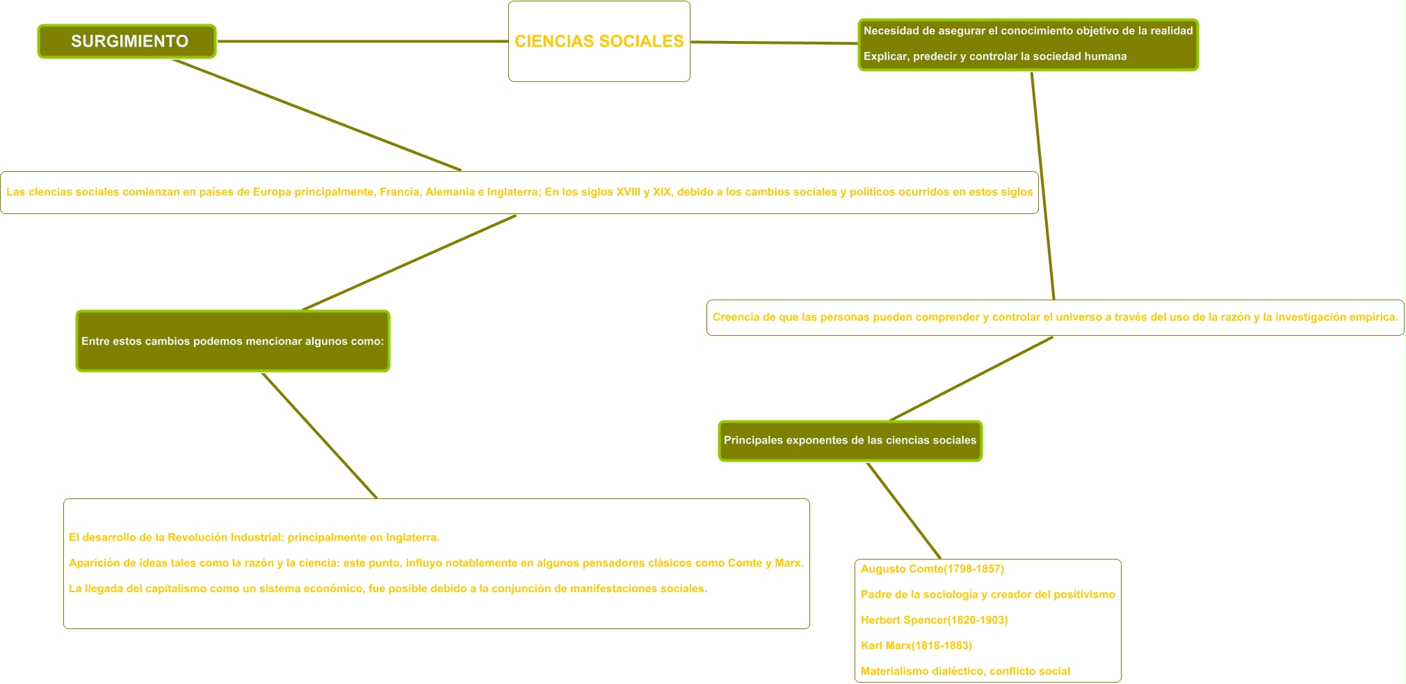 This Concept Map, created with IHMC CmapTools, has information related to: ACTIVIADOS SEMINARIO DE INVESTIGACION GESTION PUBLICA, Augusto Comte(1798-1857) Padre de la sociología y creador del positivismo Herbert Spencer(1820-1903) Karl Marx(1818-1883) Materialismo dialéctico, conflicto social Principales exponentes de las ciencias sociales Creencia de que las personas pueden comprender y controlar el universo a través del uso de la razón y la investigación empírica., CIENCIAS SOCIALES SURGIMIENTO Las cIencias sociales comienzan en países de Europa principalmente, Francia, Alemania e Inglaterra; En los siglos XVIII y XIX, debido a los cambios sociales y políticos ocurridos en estos siglos, El desarrollo de la Revolución Industrial: principalmente en Inglaterra. Aparición de ideas tales como la razón y la ciencia: este punto, influyo notablemente en algunos pensadores clásicos como Comte y Marx. La llegada del capitalismo como un sistema económico, fue posible debido a la conjunción de manifestaciones sociales. Entre estos cambios podemos mencionar algunos como: Las cIencias sociales comienzan en países de Europa principalmente, Francia, Alemania e Inglaterra; En los siglos XVIII y XIX, debido a los cambios sociales y políticos ocurridos en estos siglos, Creencia de que las personas pueden comprender y controlar el universo a través del uso de la razón y la investigación empírica. Necesidad de asegurar el conocimiento objetivo de la realidad Explicar, predecir y controlar la sociedad humana CIENCIAS SOCIALES