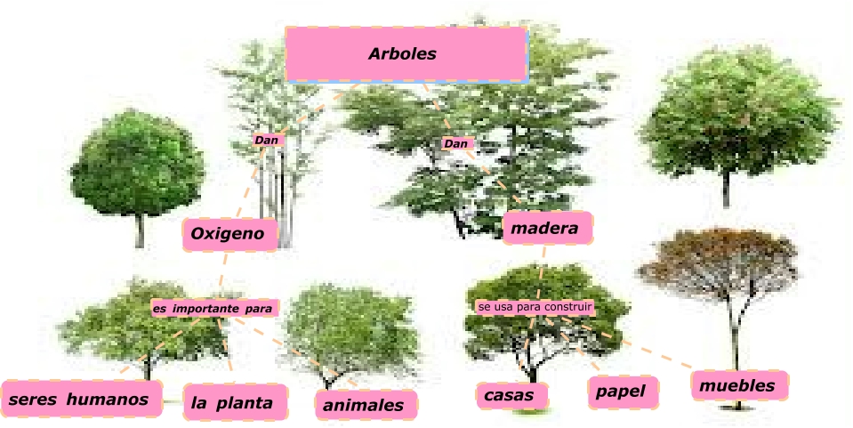 Este Cmap, tiene información relacionada con: Arboles, madera se usa para construir casas, Oxigeno es importante para seres humanos, Oxigeno es importante para la planta, madera se usa para construir muebles, Arboles Dan Oxigeno, madera se usa para construir papel, Oxigeno es importante para animales, Arboles Dan madera